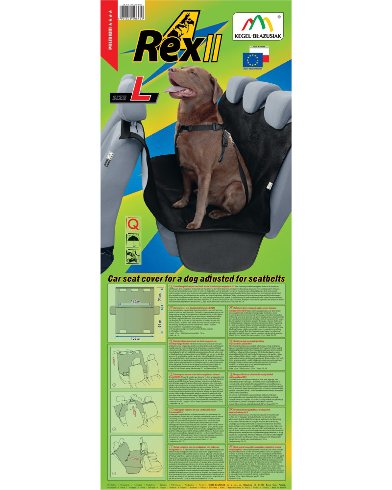 A REX II autóhuzat rendkívül praktikus termék, mely kutya vagy csomagok az autó hátsó díványán való szállítására szolgál. Nyílásokkal rendelkezik, melyeknek köszönhetően a kutyát hozzá lehet kötni az autós pórázzal a biztonsági övekhez. Ezen kívül Santos függőágyat alakít ki a hátsó dívány és az elülső ülések között. Ez lehetővé teszi a kutya biztonságos szállítását, védi a hirtelen fékezéstől és más, utazás által okozott rázkódástól. Védi a kocsi kárpitját a sártól, kosztól és egyéb karcolásoktól, melyeket a kutya szállítása vagy más nem tipikus tárgyak szállítása okozhat. A huzat vízhatlan anyagból készült, és nem ereszti át a kellemetlen szagokat sem.