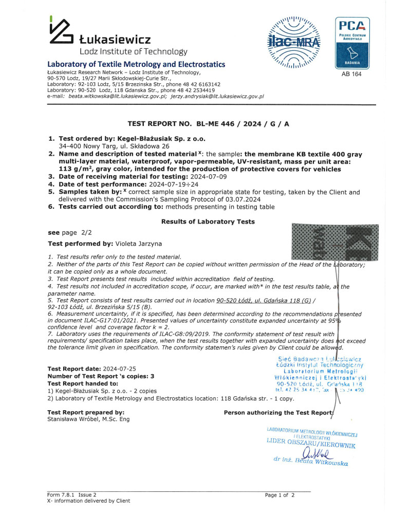 Egy autótakaró ponyva tartósságát a nap UV sugárzásával, a magas hőmérséklettel, esővel, faggyal, hóval és a használatból eredő szennyeződésekkel szemben tanúsított ellenállása határozza meg. Szakértőink többéves saját tesztelési tapasztalat alapján, illetve a PN-EN ISO 4892-3 kutatási szabványok alapján kidolgozták az anyagok környezeti hatásokkal szemben tanúsított tartósságának hatékony tesztelési módszereit. Az USA Atlas UV teszt-kamrában alapos vizsgálaton esik át minden egyes szállítani kívánt anyag, melyekből a Kegel-Błażusiak ponyvák készülnek. A gyártás során felhasznált anyagok szigorú minőségellenőrzésére hagyatkozva tehát akár intenzív használat mellett is garantáljuk az autótakaró ponyvák tartósságát .