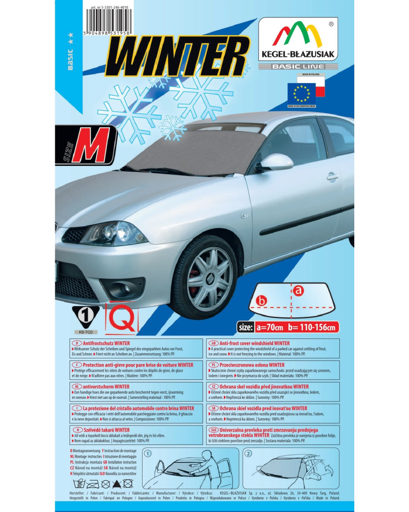 Nagyon praktikus védő, mely a szélvédőt, oldalsó ablakokat és a tükröket is védi a dértől, jégtől és hótól, amikor parkol a kocsijával. Ezen kívül gátolja a zárak befagyását. A védő jól fogja védeni a kocsi megadott részeit, Önnek pedig kényelmet és komfortérzetet biztosít. Spórolja meg az időt, kerülje el a fáradságos jégkaparást, és tartalékolja az energiáját egész napra – alkalmazza a WINTER PLUS (Basic Line sorozat) védőt. A védő magas minőségű SPUNBOND anyagból készült, egyenesen Németországból – nagyon erős, tartós, és mindenekelőtt olyan anyag, mely nem fagy oda. A kocsihoz gyengéd anyag nem okoz károkat, és nem karcol ablakokat. Nagyon könnyű feltenni és levenni, könnyű tisztítani. Az Ön kocsijának és az Ön érdekében! A sima WINTER védő elnevezést a PLUSZ-szal egészítettük ki, mivel nemcsak a szélvédőt, hanem két oldalsó ablakot és a tükröket is védi, melyek nélkülözhetetlenek ahhoz, hogy megfelelően lássuk az utat. A védőt nagyon könnyű feltenni és levenni, a rögzítésekor rá kell csapni az elülső ajtót, és fel kell tenni az oldalsó füleket a tetőhöz és a kocsi ajtajához.
