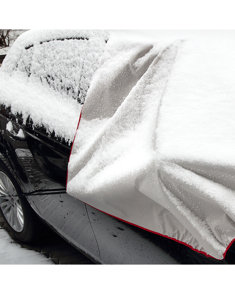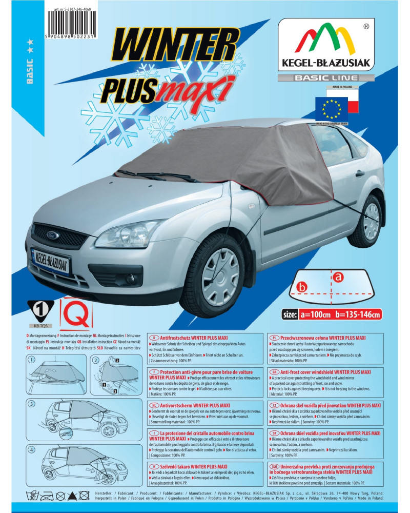 Nagyon praktikus védő, mely a szélvédőt, oldalsó ablakokat és a tükröket is védi a dértől, jégtől és hótól, amikor parkol a kocsijával. Ezen kívül gátolja a zárak befagyását. A védő jól fogja védeni a kocsi megadott részeit, Önnek pedig kényelmet és komfortérzetet biztosít. Spórolja meg az időt, kerülje el a fáradságos jégkaparást, és tartalékolja az energiáját egész napra – alkalmazza a WINTER PLUS (Basic Line sorozat) védőt. A védő magas minőségű SPUNBOND anyagból készült, egyenesen Németországból – nagyon erős, tartós, és mindenekelőtt olyan anyag, mely nem fagy oda. A kocsihoz gyengéd anyag nem okoz károkat, és nem karcol ablakokat. Nagyon könnyű feltenni és levenni, könnyű tisztítani. Az Ön kocsijának és az Ön érdekében! A sima WINTER védő elnevezést a PLUSZ-szal egészítettük ki, mivel nemcsak a szélvédőt, hanem két oldalsó ablakot és a tükröket is védi, melyek nélkülözhetetlenek ahhoz, hogy megfelelően lássuk az utat. A védőt nagyon könnyű feltenni és levenni, a rögzítésekor rá kell csapni az elülső ajtót, és fel kell tenni az oldalsó füleket a tetőhöz és a kocsi ajtajához.