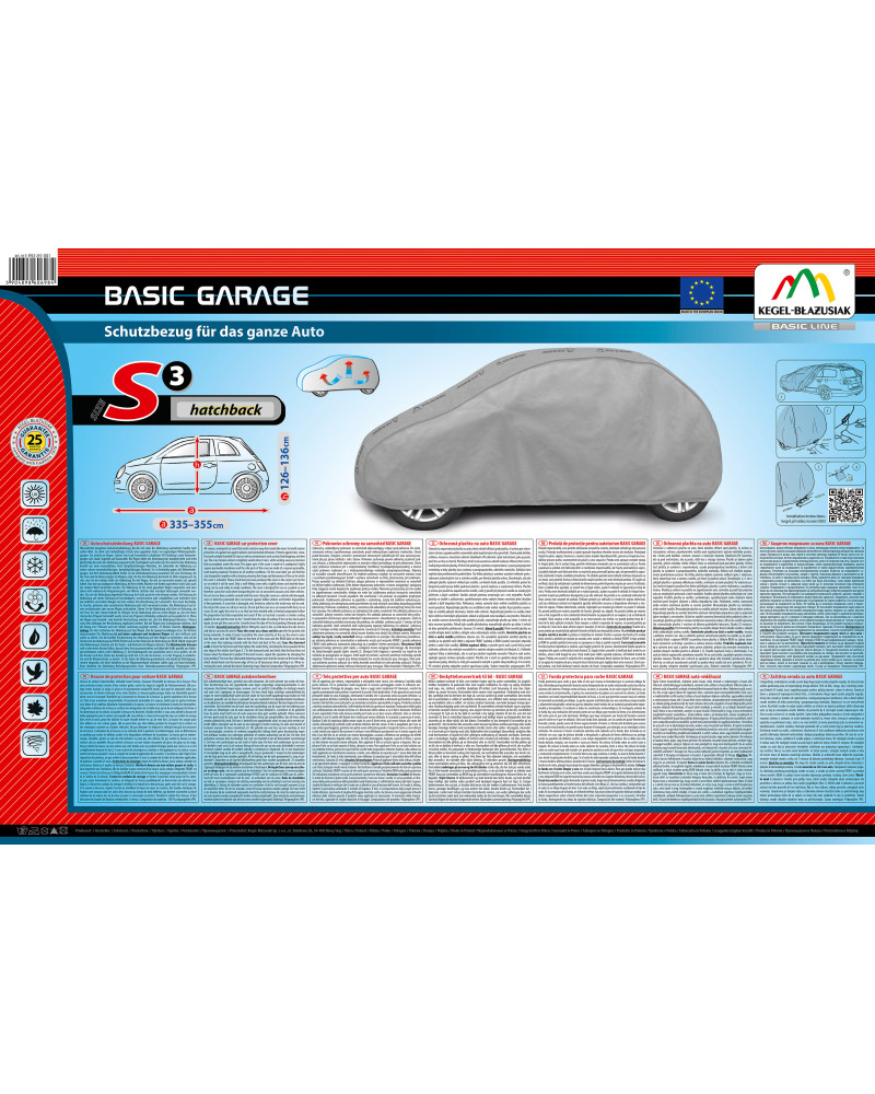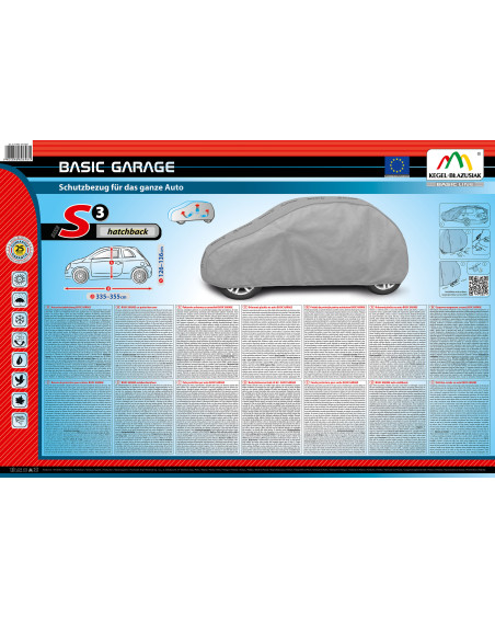 Nagyon jó minőségű, egész évben használható BASIC GARAGE autóhuzat – vízálló, és páraáteresztő. Mivel, két fajta anyagot használtunk a huzat majdanem teljesen vízálló, erős eső esetében is, és ugyanakkor amikor plusz fokok vannak kivezeti a huzat alatt összegyűlő nedvességet. A huzat védi az egész kocsit, az alsó részével együtt a környezet káros hatásától. A belső oddala sima anyagból készült, így nem karcolja a karosszériát. Huzatot egy összehúzó zsinorral rögzítjuk, amennyiben helyesen összekötjük erős széllökésektől is védi a kocsit. Mivel ebből a sorozatból származó huzatok több méretben, és több alakváltozatban kaphatók (ahogy más huzataink is), jól összepasszolhatók konkrét kocsival. A Basic Garage huzatok napálló-, környezeti hatásokra való tulajdonságait ellenőrizték, amit midnegyik termékhez adott, írásbeli, 25 hónapra szóló garancia igazol.