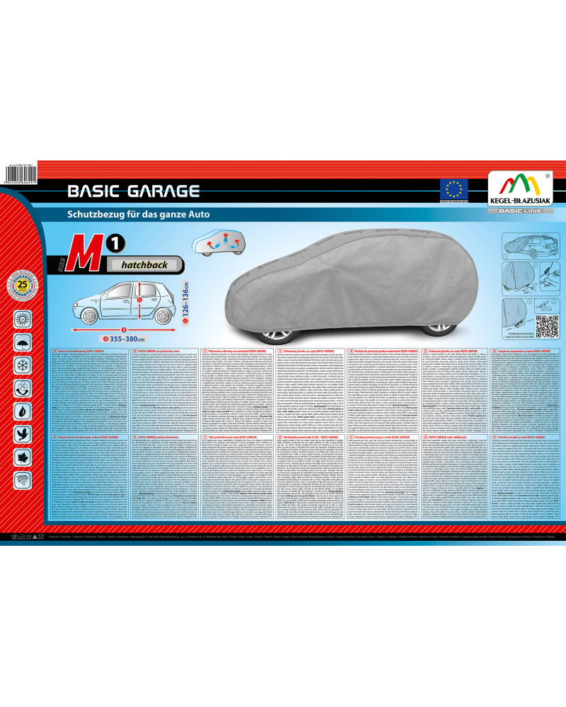 Nagyon jó minőségű, egész évben használható BASIC GARAGE autóhuzat – vízálló, és páraáteresztő. Mivel, két fajta anyagot használtunk a huzat majdanem teljesen vízálló, erős eső esetében is, és ugyanakkor amikor plusz fokok vannak kivezeti a huzat alatt összegyűlő nedvességet. A huzat védi az egész kocsit, az alsó részével együtt a környezet káros hatásától. A belső oddala sima anyagból készült, így nem karcolja a karosszériát. Huzatot egy összehúzó zsinorral rögzítjuk, amennyiben helyesen összekötjük erős széllökésektől is védi a kocsit. Mivel ebből a sorozatból származó huzatok több méretben, és több alakváltozatban kaphatók (ahogy más huzataink is), jól összepasszolhatók konkrét kocsival. A Basic Garage huzatok napálló-, környezeti hatásokra való tulajdonságait ellenőrizték, amit midnegyik termékhez adott, írásbeli, 25 hónapra szóló garancia igazol.