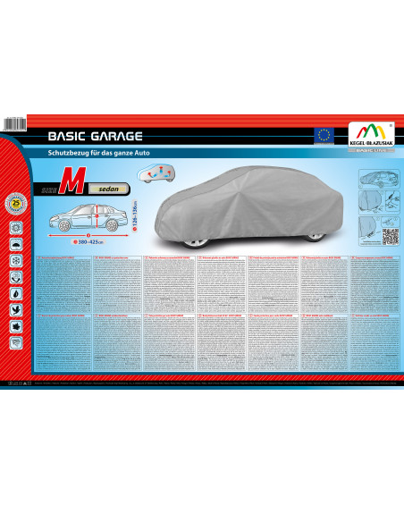Nagyon jó minőségű, egész évben használható BASIC GARAGE autóhuzat – vízálló, és páraáteresztő. Mivel, két fajta anyagot használtunk a huzat majdanem teljesen vízálló, erős eső esetében is, és ugyanakkor amikor plusz fokok vannak kivezeti a huzat alatt összegyűlő nedvességet. A huzat védi az egész kocsit, az alsó részével együtt a környezet káros hatásától. A belső oddala sima anyagból készült, így nem karcolja a karosszériát. Huzatot egy összehúzó zsinorral rögzítjuk, amennyiben helyesen összekötjük erős széllökésektől is védi a kocsit. Mivel ebből a sorozatból származó huzatok több méretben, és több alakváltozatban kaphatók (ahogy más huzataink is), jól összepasszolhatók konkrét kocsival. A Basic Garage huzatok napálló-, környezeti hatásokra való tulajdonságait ellenőrizték, amit midnegyik termékhez adott, írásbeli, 25 hónapra szóló garancia igazol.