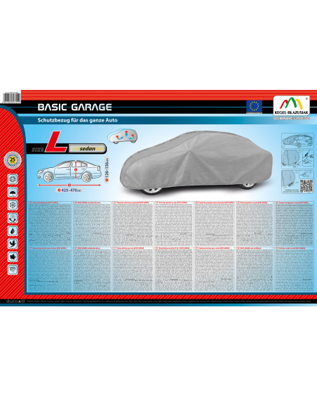 Nagyon jó minőségű, egész évben használható BASIC GARAGE autóhuzat – vízálló, és páraáteresztő. Mivel, két fajta anyagot használtunk a huzat majdanem teljesen vízálló, erős eső esetében is, és ugyanakkor amikor plusz fokok vannak kivezeti a huzat alatt összegyűlő nedvességet. A huzat védi az egész kocsit, az alsó részével együtt a környezet káros hatásától. A belső oddala sima anyagból készült, így nem karcolja a karosszériát. Huzatot egy összehúzó zsinorral rögzítjuk, amennyiben helyesen összekötjük erős széllökésektől is védi a kocsit. Mivel ebből a sorozatból származó huzatok több méretben, és több alakváltozatban kaphatók (ahogy más huzataink is), jól összepasszolhatók konkrét kocsival. A Basic Garage huzatok napálló-, környezeti hatásokra való tulajdonságait ellenőrizték, amit midnegyik termékhez adott, írásbeli, 25 hónapra szóló garancia igazol.