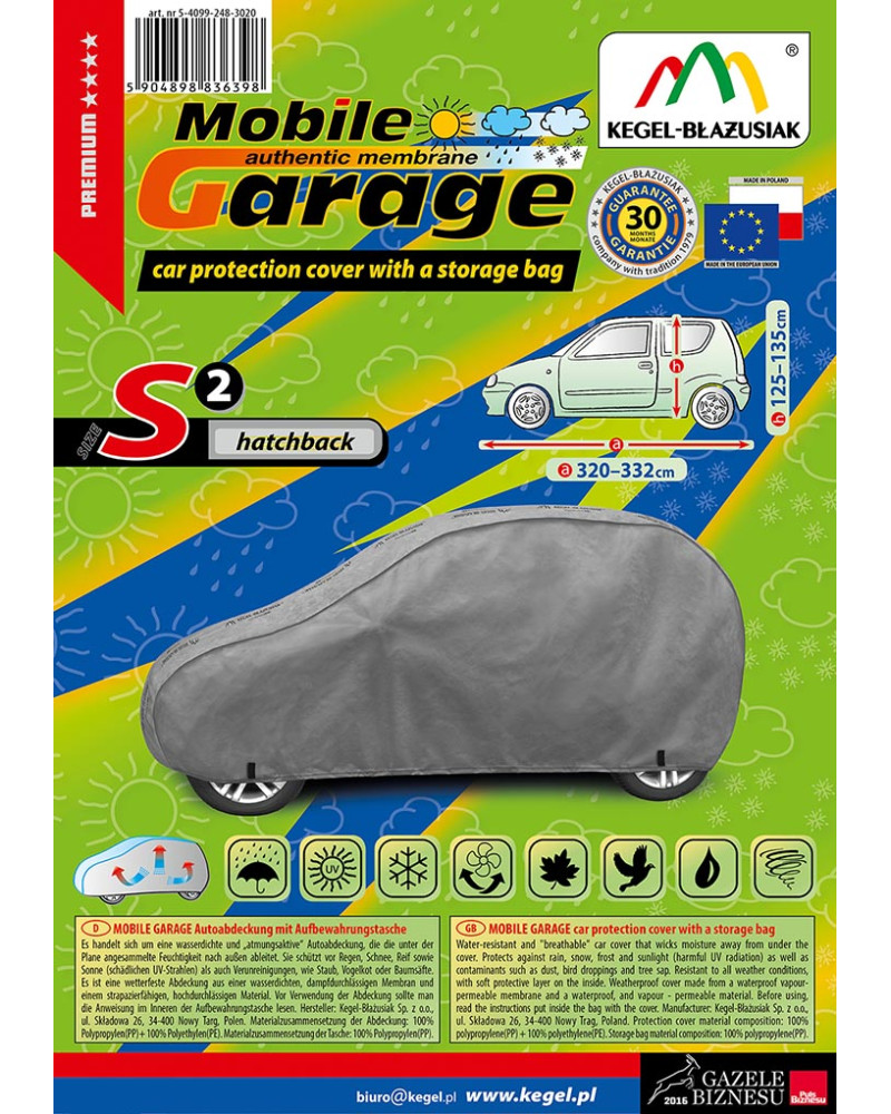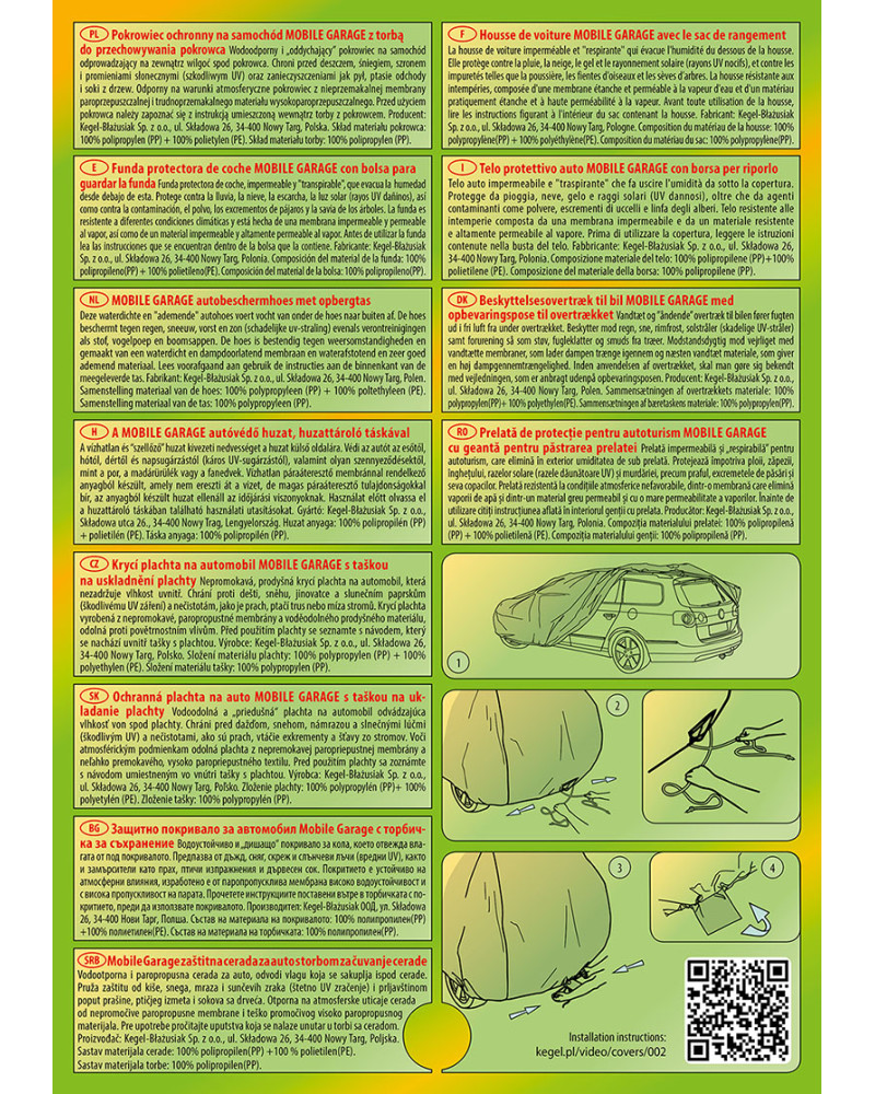 A magas minőségű, autókra való MOBILE GARAGE huzatok vízhatlanok, de páraáteresztőek. A huzat négyrétegű, vízhatlan, páraáteresztő membránból és nehezen vizesedő, de magas páraáteresztő képességgel rendelkező anyagokból készült, majdnem teljesen szoros, de ugyanakkor elvezeti a huzat alatt összegyűlő nedvet. Az egész kocsit, az alsó részével együtt védi a kedvezőtlen környezeti hatásoktól. A huzatok UV-sugárzás ellenállóak. A rögzítésük kocsit körbefogó zsinórral történik, megfelelően összekötve biztosítják a kocsit erős szél esetében is. Mivel az ajánlatunkban több alakban és méretben találhatóak, különböző kocsikhoz illenek. A 30 hónapra szóló garanciának köszönhetően biztos lehet abban, hogy a legmagasabb minőségű terméket vásárolja.
