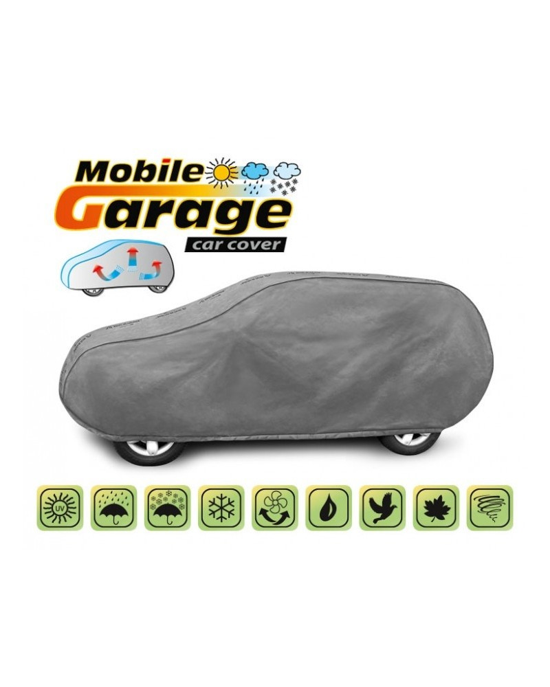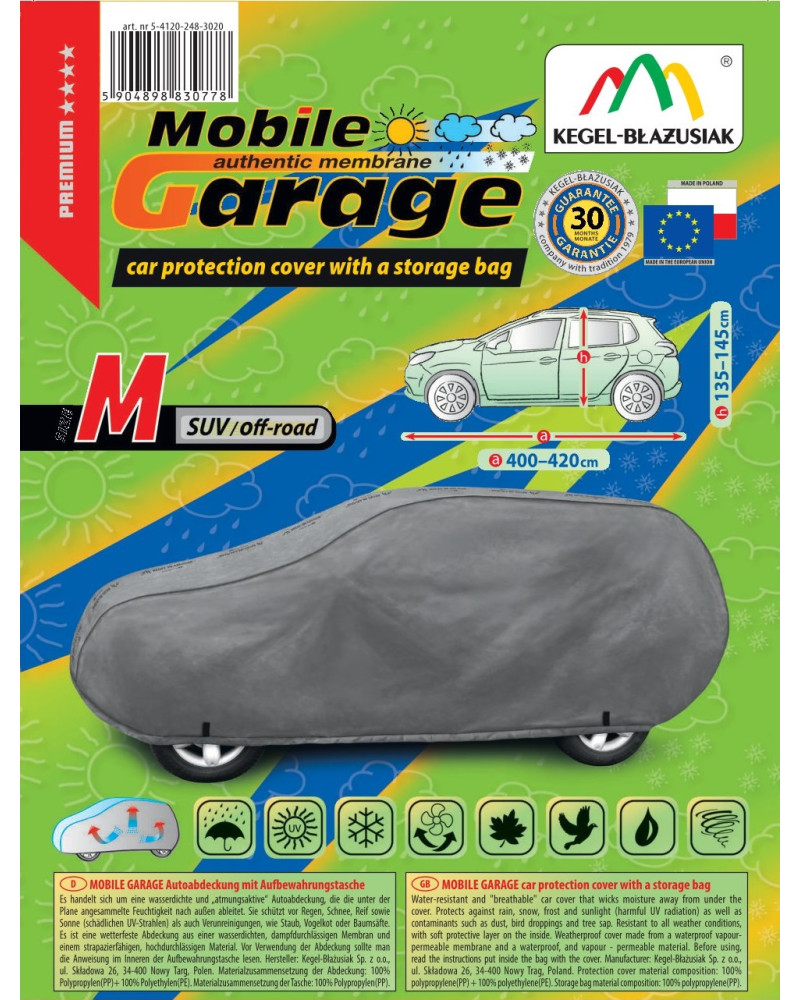 A magas minőségű, autókra való MOBILE GARAGE huzatok vízhatlanok, de páraáteresztőek. A huzat négyrétegű, vízhatlan, páraáteresztő membránból és nehezen vizesedő, de magas páraáteresztő képességgel rendelkező anyagokból készült, majdnem teljesen szoros, de ugyanakkor elvezeti a huzat alatt összegyűlő nedvet. Az egész kocsit, az alsó részével együtt védi a kedvezőtlen környezeti hatásoktól. A huzatok UV-sugárzás ellenállóak. A rögzítésük kocsit körbefogó zsinórral történik, megfelelően összekötve biztosítják a kocsit erős szél esetében is. Mivel az ajánlatunkban több alakban és méretben találhatóak, különböző kocsikhoz illenek. A 30 hónapra szóló garanciának köszönhetően biztos lehet abban, hogy a legmagasabb minőségű terméket vásárolja.