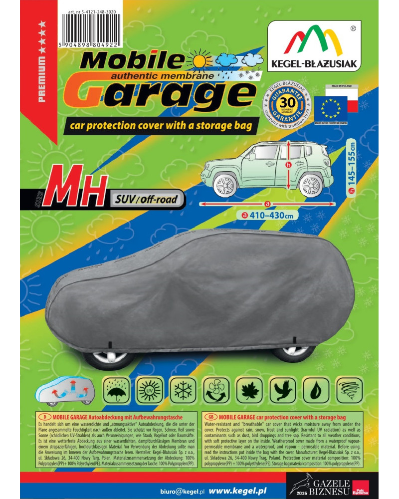 A magas minőségű, autókra való MOBILE GARAGE huzatok vízhatlanok, de páraáteresztőek. A huzat négyrétegű, vízhatlan, páraáteresztő membránból és nehezen vizesedő, de magas páraáteresztő képességgel rendelkező anyagokból készült, majdnem teljesen szoros, de ugyanakkor elvezeti a huzat alatt összegyűlő nedvet. Az egész kocsit, az alsó részével együtt védi a kedvezőtlen környezeti hatásoktól. A huzatok UV-sugárzás ellenállóak. A rögzítésük kocsit körbefogó zsinórral történik, megfelelően összekötve biztosítják a kocsit erős szél esetében is. Mivel az ajánlatunkban több alakban és méretben találhatóak, különböző kocsikhoz illenek. A 30 hónapra szóló garanciának köszönhetően biztos lehet abban, hogy a legmagasabb minőségű terméket vásárolja.