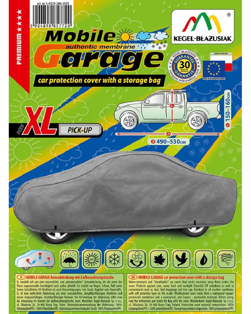 A magas minőségű, autókra való MOBILE GARAGE huzatok vízhatlanok, de páraáteresztőek. A huzat négyrétegű, vízhatlan, páraáteresztő membránból és nehezen vizesedő, de magas páraáteresztő képességgel rendelkező anyagokból készült, majdnem teljesen szoros, de ugyanakkor elvezeti a huzat alatt összegyűlő nedvet. Az egész kocsit, az alsó részével együtt védi a kedvezőtlen környezeti hatásoktól. A huzatok UV-sugárzás ellenállóak. A rögzítésük kocsit körbefogó zsinórral történik, megfelelően összekötve biztosítják a kocsit erős szél esetében is. Mivel az ajánlatunkban több alakban és méretben találhatóak, különböző kocsikhoz illenek. A 30 hónapra szóló garanciának köszönhetően biztos lehet abban, hogy a legmagasabb minőségű terméket vásárolja.