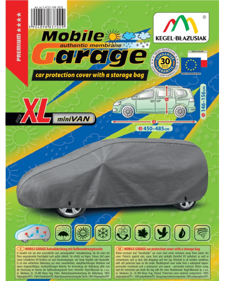 A magas minőségű, autókra való MOBILE GARAGE huzatok vízhatlanok, de páraáteresztőek. A huzat négyrétegű, vízhatlan, páraáteresztő membránból és nehezen vizesedő, de magas páraáteresztő képességgel rendelkező anyagokból készült, majdnem teljesen szoros, de ugyanakkor elvezeti a huzat alatt összegyűlő nedvet. Az egész kocsit, az alsó részével együtt védi a kedvezőtlen környezeti hatásoktól. A huzatok UV-sugárzás ellenállóak. A rögzítésük kocsit körbefogó zsinórral történik, megfelelően összekötve biztosítják a kocsit erős szél esetében is. Mivel az ajánlatunkban több alakban és méretben találhatóak, különböző kocsikhoz illenek. A 30 hónapra szóló garanciának köszönhetően biztos lehet abban, hogy a legmagasabb minőségű terméket vásárolja.