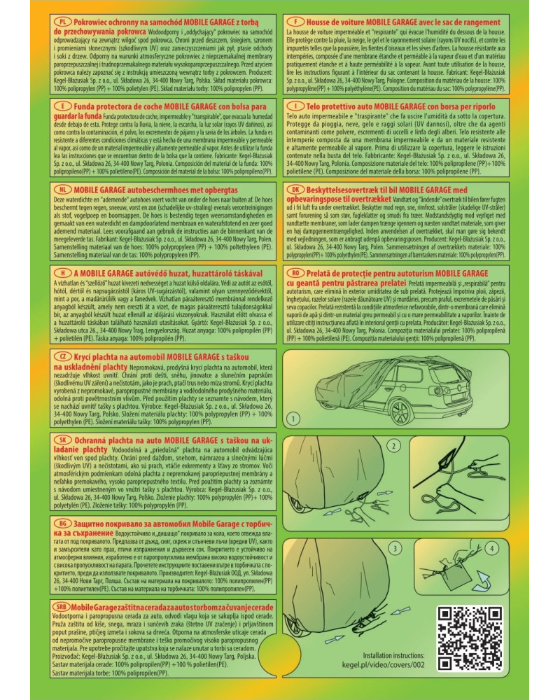A magas minőségű, autókra való MOBILE GARAGE huzatok vízhatlanok, de páraáteresztőek. A huzat négyrétegű, vízhatlan, páraáteresztő membránból és nehezen vizesedő, de magas páraáteresztő képességgel rendelkező anyagokból készült, majdnem teljesen szoros, de ugyanakkor elvezeti a huzat alatt összegyűlő nedvet. Az egész kocsit, az alsó részével együtt védi a kedvezőtlen környezeti hatásoktól. A huzatok UV-sugárzás ellenállóak. A rögzítésük kocsit körbefogó zsinórral történik, megfelelően összekötve biztosítják a kocsit erős szél esetében is. Mivel az ajánlatunkban több alakban és méretben találhatóak, különböző kocsikhoz illenek. A 30 hónapra szóló garanciának köszönhetően biztos lehet abban, hogy a legmagasabb minőségű terméket vásárolja.