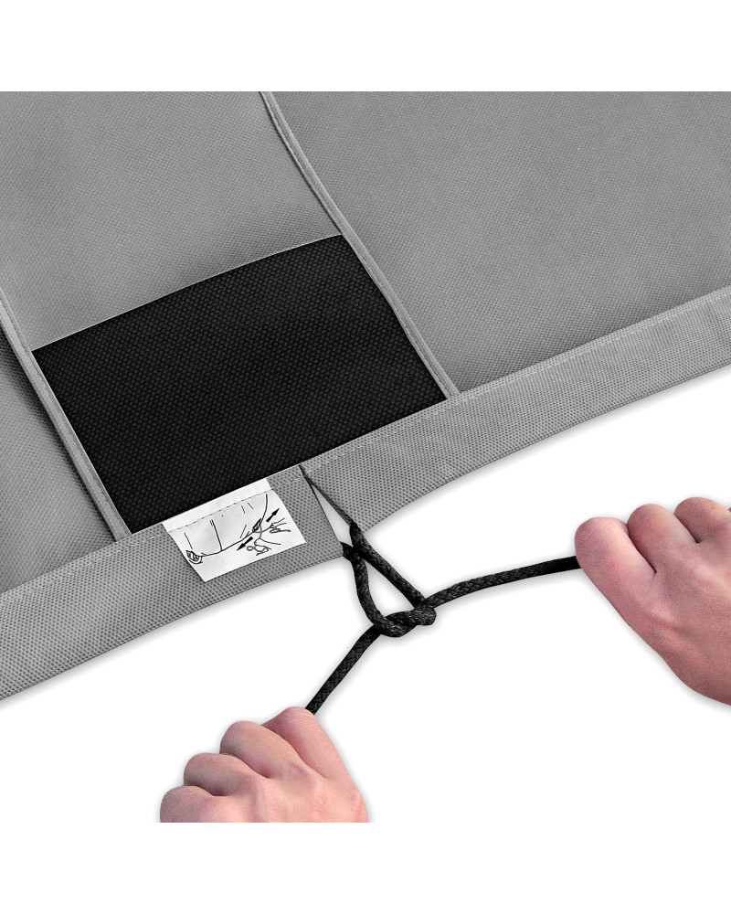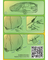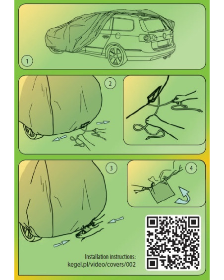 Mielőtt feltenné a huzatot az autóra, hajtsa be az oldalsó tükröket, valamint hajtsa össze vagy csavarja le az antennát. A huzatot tiszta és száraz autóra helyezze fel, a felirattal kifelé. A huzat megfelelő felhelyezésének érdekében a huzaton egy FRONT (elülső résznél) és REAR (hátsó résznél) feliratú címke található (a jelölések a kocsi elülső és hátsó részének felelnek meg). Tegye keresztbe a köteleket, így alakítsa ki az első csomót, majd erősen húzza meg a köteleket olyan módon, hogy a köteleket a jármű hátsó szélével párhuzamosan irányítja (lásd a 2. ábra a huzat belső címkéjén). Kösse össze az összehúzó köteleket, és nézze meg, hogy a csomó a kötél meghúzása után, nem lazult-e meg. Amennyiben a csomó meglazul, ismételje meg az eljárást, de ezúttal változtassa meg a kötés módját. A köteleket vezesse át a huzat alsó szélén lévő hurkokon a kocsi kerekei mellett, majd rögzítse a huzatot az abroncsokhoz (de ne a dísztárcsákhoz).