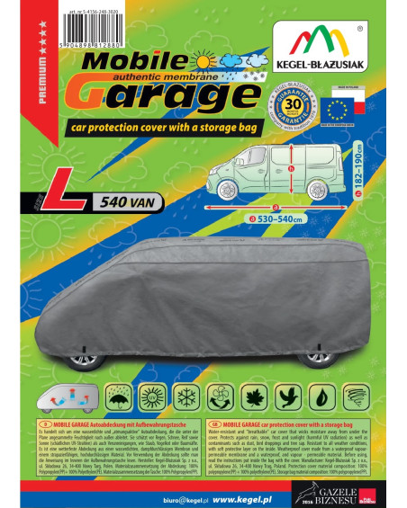 A magas minőségű, autókra való MOBILE GARAGE huzatok vízhatlanok, de páraáteresztőek. A huzat négyrétegű, vízhatlan, páraáteresztő membránból és nehezen vizesedő, de magas páraáteresztő képességgel rendelkező anyagokból készült, majdnem teljesen szoros, de ugyanakkor elvezeti a huzat alatt összegyűlő nedvet. Az egész kocsit, az alsó részével együtt védi a kedvezőtlen környezeti hatásoktól. A huzatok UV-sugárzás ellenállóak. A rögzítésük kocsit körbefogó zsinórral történik, megfelelően összekötve biztosítják a kocsit erős szél esetében is. Mivel az ajánlatunkban több alakban és méretben találhatóak, különböző kocsikhoz illenek. A 30 hónapra szóló garanciának köszönhetően biztos lehet abban, hogy a legmagasabb minőségű terméket vásárolja.