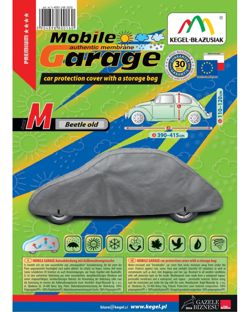 A magas minőségű, autókra való MOBILE GARAGE huzatok vízhatlanok, de páraáteresztőek. A huzat négyrétegű, vízhatlan, páraáteresztő membránból és nehezen vizesedő, de magas páraáteresztő képességgel rendelkező anyagokból készült, majdnem teljesen szoros, de ugyanakkor elvezeti a huzat alatt összegyűlő nedvet. Az egész kocsit, az alsó részével együtt védi a kedvezőtlen környezeti hatásoktól. A huzatok UV-sugárzás ellenállóak. A rögzítésük kocsit körbefogó zsinórral történik, megfelelően összekötve biztosítják a kocsit erős szél esetében is. Mivel az ajánlatunkban több alakban és méretben találhatóak, különböző kocsikhoz illenek. A 30 hónapra szóló garanciának köszönhetően biztos lehet abban, hogy a legmagasabb minőségű terméket vásárolja.