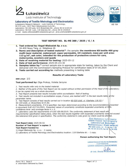 Egy autótakaró ponyva tartósságát a nap UV sugárzásával, a magas hőmérséklettel, esővel, faggyal, hóval és a használatból eredő szennyeződésekkel szemben tanúsított ellenállása határozza meg. Szakértőink többéves saját tesztelési tapasztalat alapján, illetve a PN-EN ISO 4892-3 kutatási szabványok alapján kidolgozták az anyagok környezeti hatásokkal szemben tanúsított tartósságának hatékony tesztelési módszereit. Az USA Atlas UV teszt-kamrában alapos vizsgálaton esik át minden egyes szállítani kívánt anyag, melyekből a Kegel-Błażusiak ponyvák készülnek. A gyártás során felhasznált anyagok szigorú minőségellenőrzésére hagyatkozva tehát akár intenzív használat mellett is garantáljuk az autótakaró ponyvák tartósságát .