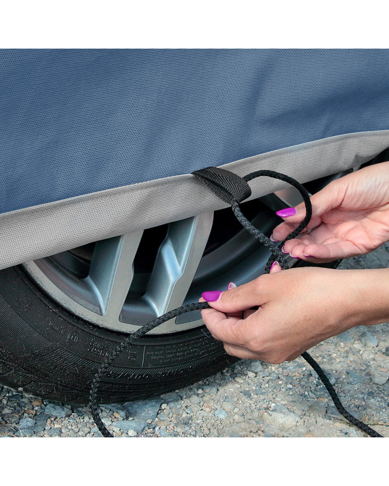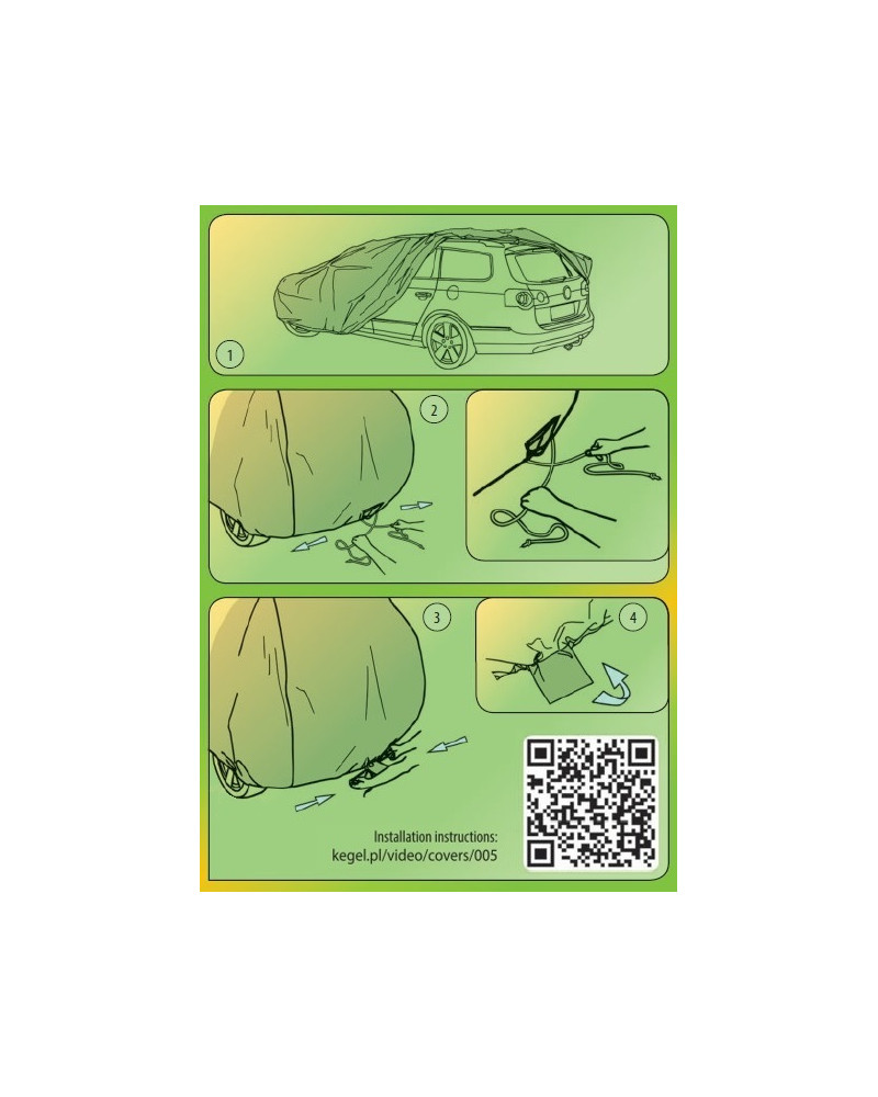 Mielőtt feltenné a huzatot az autóra, hajtsa be az oldalsó tükröket, valamint hajtsa össze vagy csavarja le az antennát. A huzatot tiszta és száraz autóra helyezze fel, a felirattal kifelé. A huzat megfelelő felhelyezésének érdekében a huzaton egy FRONT (elülső résznél) és REAR (hátsó résznél) feliratú címke található (a jelölések a kocsi elülső és hátsó részének felelnek meg). Tegye keresztbe a köteleket, így alakítsa ki az első csomót, majd erősen húzza meg a köteleket olyan módon, hogy a köteleket a jármű hátsó szélével párhuzamosan irányítja (lásd a 2. ábra a huzat belső címkéjén). Kösse össze az összehúzó köteleket, és nézze meg, hogy a csomó a kötél meghúzása után, nem lazult-e meg. Amennyiben a csomó meglazul, ismételje meg az eljárást, de ezúttal változtassa meg a kötés módját. A köteleket vezesse át a huzat alsó szélén lévő hurkokon a kocsi kerekei mellett, majd rögzítse a huzatot az abroncsokhoz (de ne a dísztárcsákhoz).