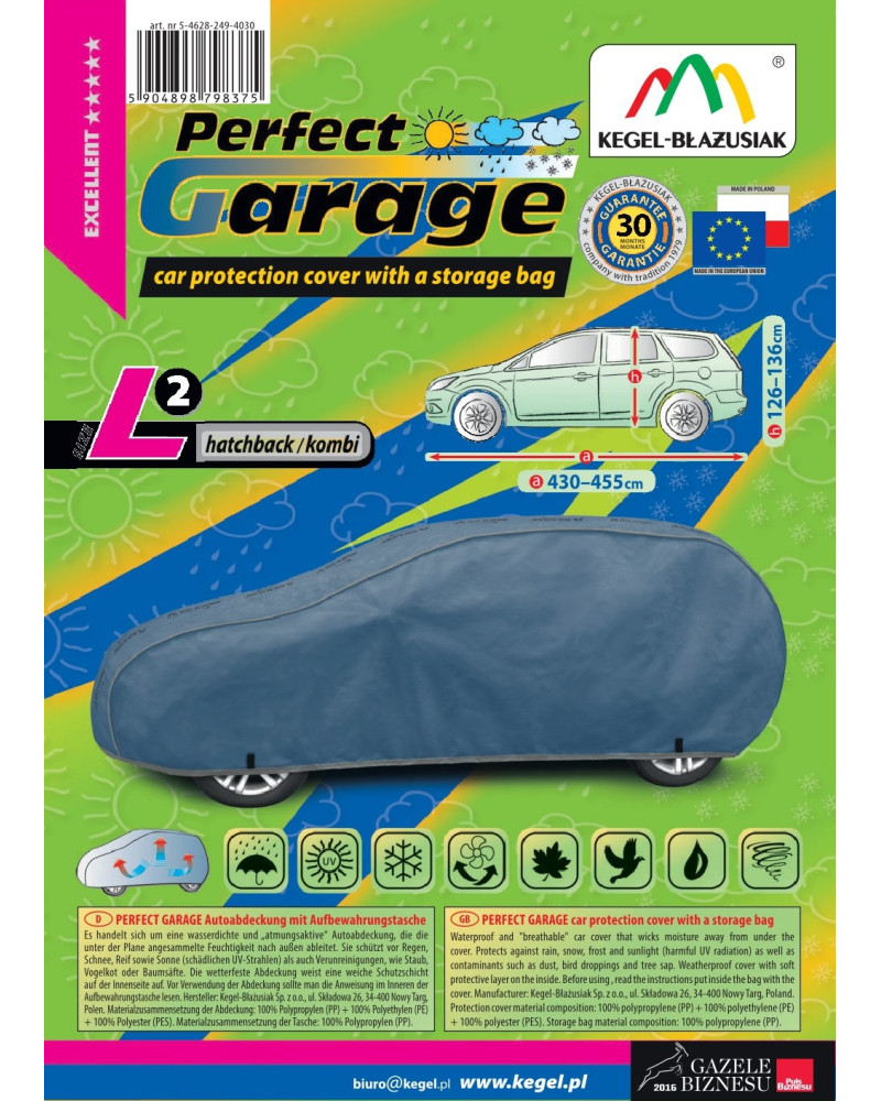 A PERFECT GARAGE huzat jól méretezett huzat, rögzítése az egész kocsit körbefogó hagyományos összehúzható zsinórral megoldható, maga a huzat pedig erős, és a belső oldalán puha anyagból készült, minek köszönhetően a használata biztonságos erős széllökések esetében is. Könnyen feltehető és levehető. Összehajtás után a huzat nem foglal sok helyet, így mindig el lehet vinni. A Perfect Garage huzatot elegáns és esztétikus sötétkék színben gyártjuk, hogy különbözzön más ponyváktól. Annak ellenére, hogy a sötétkék egy sötét szín, a PERFECT GARAGE huzat még ellenállóbb a napsugárzással szemben. A huzat felső részén a Kegel-Błażusiak KB Textil felirat látható, hogy a potenciális ügyfelek lássák, milyen márkájú huzatot keressenek.