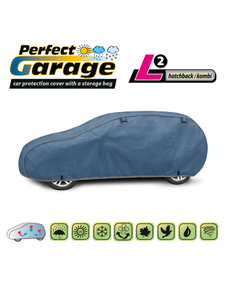Új, membránból készült PERFECT GARAGE autós védőhuzat a népszerű MOBILE GARAGE ponyvák jobb verziója. Teljes mértékben páraáteresztő, sík, puha tapintású alsó résszel. A membrán, melyből a PERFECT GARAGE huzat készül, 20%-kal vastagabb, ugyanakkor puhább, mint a MOBILE GARAGE membránja. Az anyag négy rétegből készült, páraáteresztő, de vízhatlan membránnal rendelkezik, minek köszönhetően a huzat teljes mértékben vízhatlan, ugyanakkor átereszti a párát, mely a huzat alól jön ki. A leparkolt kocsi, melyen a PERFECT GARAGE huzat van, száraz marad, a pára pedig elpárolog a huzat membránján keresztül, így védve a kocsit a rozsdásodással szemben. Ezen kívül a huzat védi a kocsit a sérülésektől, a fakulástól, és a lakk és a krómozott elemeket a mattá válástól. Véd az esőtől (savas esőtől is), naptól (UV sugárzástól), portól, madárürüléktől, levelektől és fák levétől, valamint a hótól és dértől. A huzat puha bélése védi a kocsi lakkját a karcolások többségétől. A 30 hónapra szóló garanciának köszönhetően biztos lehet abban, hogy a legmagasabb minőségű terméket vásárolja.