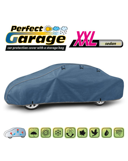 Új, membránból készült PERFECT GARAGE autós védőhuzat a népszerű MOBILE GARAGE ponyvák jobb verziója. Teljes mértékben páraáteresztő, sík, puha tapintású alsó résszel. A membrán, melyből a PERFECT GARAGE huzat készül, 20%-kal vastagabb, ugyanakkor puhább, mint a MOBILE GARAGE membránja. Az anyag négy rétegből készült, páraáteresztő, de vízhatlan membránnal rendelkezik, minek köszönhetően a huzat teljes mértékben vízhatlan, ugyanakkor átereszti a párát, mely a huzat alól jön ki. A leparkolt kocsi, melyen a PERFECT GARAGE huzat van, száraz marad, a pára pedig elpárolog a huzat membránján keresztül, így védve a kocsit a rozsdásodással szemben. Ezen kívül a huzat védi a kocsit a sérülésektől, a fakulástól, és a lakk és a krómozott elemeket a mattá válástól. Véd az esőtől (savas esőtől is), naptól (UV sugárzástól), portól, madárürüléktől, levelektől és fák levétől, valamint a hótól és dértől. A huzat puha bélése védi a kocsi lakkját a karcolások többségétől. A 30 hónapra szóló garanciának köszönhetően biztos lehet abban, hogy a legmagasabb minőségű terméket vásárolja.