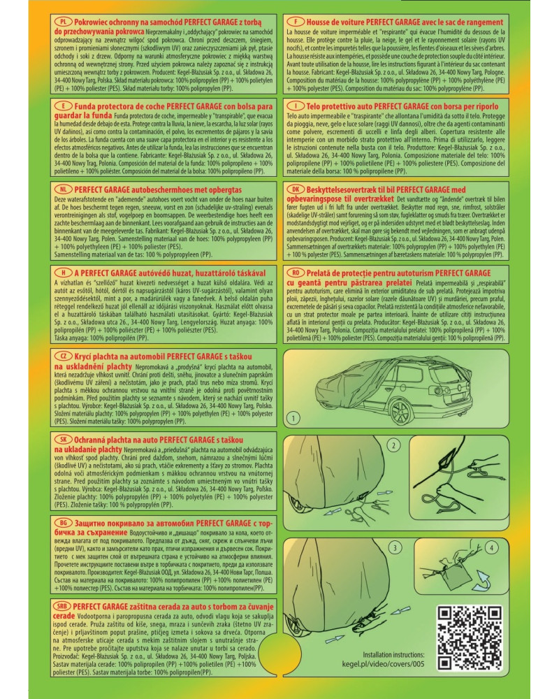 Új, membránból készült PERFECT GARAGE autós védőhuzat a népszerű MOBILE GARAGE ponyvák jobb verziója. Teljes mértékben páraáteresztő, sík, puha tapintású alsó résszel. A membrán, melyből a PERFECT GARAGE huzat készül, 20%-kal vastagabb, ugyanakkor puhább, mint a MOBILE GARAGE membránja. Az anyag négy rétegből készült, páraáteresztő, de vízhatlan membránnal rendelkezik, minek köszönhetően a huzat teljes mértékben vízhatlan, ugyanakkor átereszti a párát, mely a huzat alól jön ki. A leparkolt kocsi, melyen a PERFECT GARAGE huzat van, száraz marad, a pára pedig elpárolog a huzat membránján keresztül, így védve a kocsit a rozsdásodással szemben. Ezen kívül a huzat védi a kocsit a sérülésektől, a fakulástól, és a lakk és a krómozott elemeket a mattá válástól. Véd az esőtől (savas esőtől is), naptól (UV sugárzástól), portól, madárürüléktől, levelektől és fák levétől, valamint a hótól és dértől. A huzat puha bélése védi a kocsi lakkját a karcolások többségétől. A 30 hónapra szóló garanciának köszönhetően biztos lehet abban, hogy a legmagasabb minőségű terméket vásárolja.
