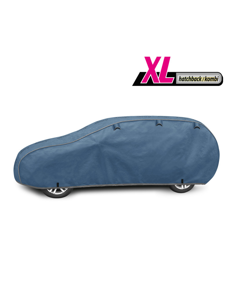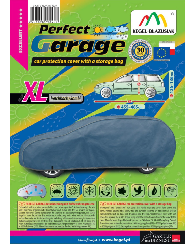 A PERFECT GARAGE huzat jól méretezett huzat, rögzítése az egész kocsit körbefogó hagyományos összehúzható zsinórral megoldható, maga a huzat pedig erős, és a belső oldalán puha anyagból készült, minek köszönhetően a használata biztonságos erős széllökések esetében is. Könnyen feltehető és levehető. Összehajtás után a huzat nem foglal sok helyet, így mindig el lehet vinni. A Perfect Garage huzatot elegáns és esztétikus sötétkék színben gyártjuk, hogy különbözzön más ponyváktól. Annak ellenére, hogy a sötétkék egy sötét szín, a PERFECT GARAGE huzat még ellenállóbb a napsugárzással szemben. A huzat felső részén a Kegel-Błażusiak KB Textil felirat látható, hogy a potenciális ügyfelek lássák, milyen márkájú huzatot keressenek.