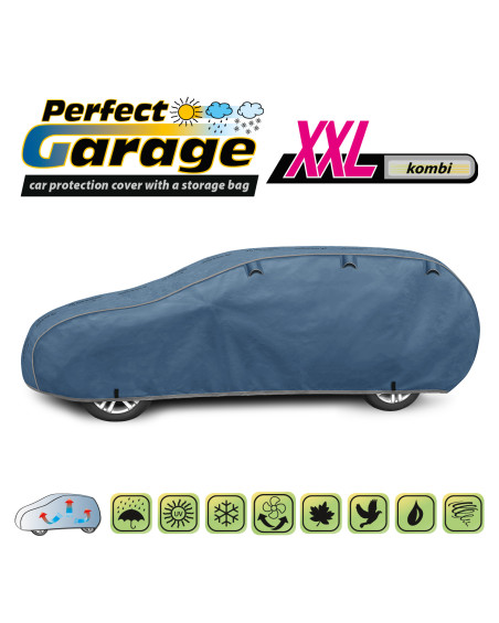 Új, membránból készült PERFECT GARAGE autós védőhuzat a népszerű MOBILE GARAGE ponyvák jobb verziója. Teljes mértékben páraáteresztő, sík, puha tapintású alsó résszel. A membrán, melyből a PERFECT GARAGE huzat készül, 20%-kal vastagabb, ugyanakkor puhább, mint a MOBILE GARAGE membránja. Az anyag négy rétegből készült, páraáteresztő, de vízhatlan membránnal rendelkezik, minek köszönhetően a huzat teljes mértékben vízhatlan, ugyanakkor átereszti a párát, mely a huzat alól jön ki. A leparkolt kocsi, melyen a PERFECT GARAGE huzat van, száraz marad, a pára pedig elpárolog a huzat membránján keresztül, így védve a kocsit a rozsdásodással szemben. Ezen kívül a huzat védi a kocsit a sérülésektől, a fakulástól, és a lakk és a krómozott elemeket a mattá válástól. Véd az esőtől (savas esőtől is), naptól (UV sugárzástól), portól, madárürüléktől, levelektől és fák levétől, valamint a hótól és dértől. A huzat puha bélése védi a kocsi lakkját a karcolások többségétől. A 30 hónapra szóló garanciának köszönhetően biztos lehet abban, hogy a legmagasabb minőségű terméket vásárolja.