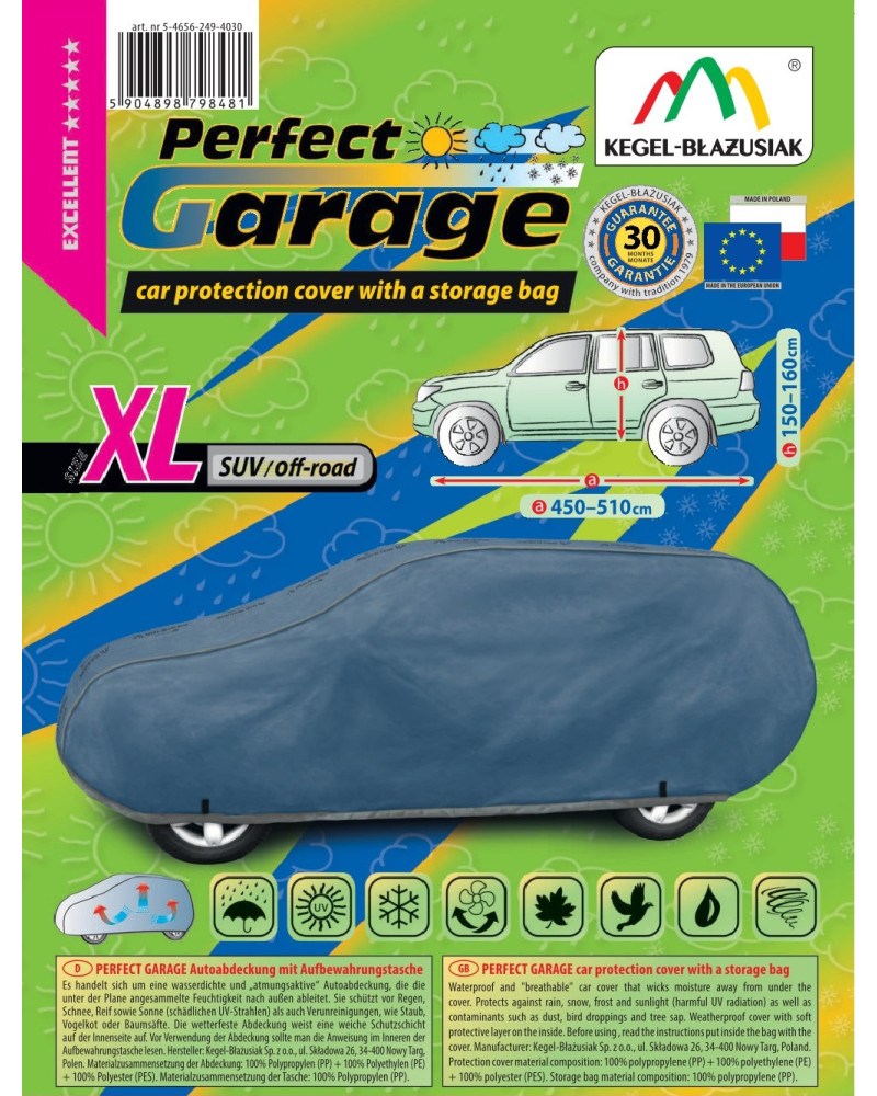 Új, membránból készült PERFECT GARAGE autós védőhuzat a népszerű MOBILE GARAGE ponyvák jobb verziója. Teljes mértékben páraáteresztő, sík, puha tapintású alsó résszel. A membrán, melyből a PERFECT GARAGE huzat készül, 20%-kal vastagabb, ugyanakkor puhább, mint a MOBILE GARAGE membránja. Az anyag négy rétegből készült, páraáteresztő, de vízhatlan membránnal rendelkezik, minek köszönhetően a huzat teljes mértékben vízhatlan, ugyanakkor átereszti a párát, mely a huzat alól jön ki. A leparkolt kocsi, melyen a PERFECT GARAGE huzat van, száraz marad, a pára pedig elpárolog a huzat membránján keresztül, így védve a kocsit a rozsdásodással szemben. Ezen kívül a huzat védi a kocsit a sérülésektől, a fakulástól, és a lakk és a krómozott elemeket a mattá válástól. Véd az esőtől (savas esőtől is), naptól (UV sugárzástól), portól, madárürüléktől, levelektől és fák levétől, valamint a hótól és dértől. A huzat puha bélése védi a kocsi lakkját a karcolások többségétől. A 30 hónapra szóló garanciának köszönhetően biztos lehet abban, hogy a legmagasabb minőségű terméket vásárolja.