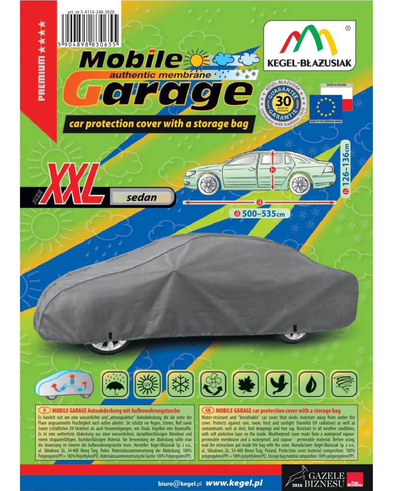 A magas minőségű, autókra való MOBILE GARAGE huzatok vízhatlanok, de páraáteresztőek. A huzat négyrétegű, vízhatlan, páraáteresztő membránból és nehezen vizesedő, de magas páraáteresztő képességgel rendelkező anyagokból készült, majdnem teljesen szoros, de ugyanakkor elvezeti a huzat alatt összegyűlő nedvet. Az egész kocsit, az alsó részével együtt védi a kedvezőtlen környezeti hatásoktól. A huzatok UV-sugárzás ellenállóak. A rögzítésük kocsit körbefogó zsinórral történik, megfelelően összekötve biztosítják a kocsit erős szél esetében is. Mivel az ajánlatunkban több alakban és méretben találhatóak, különböző kocsikhoz illenek. A 30 hónapra szóló garanciának köszönhetően biztos lehet abban, hogy a legmagasabb minőségű terméket vásárolja.