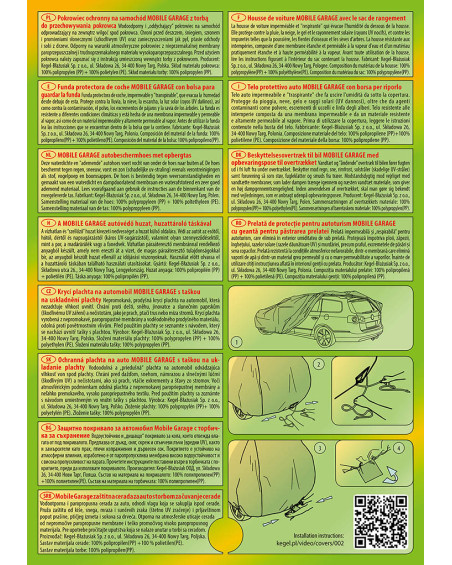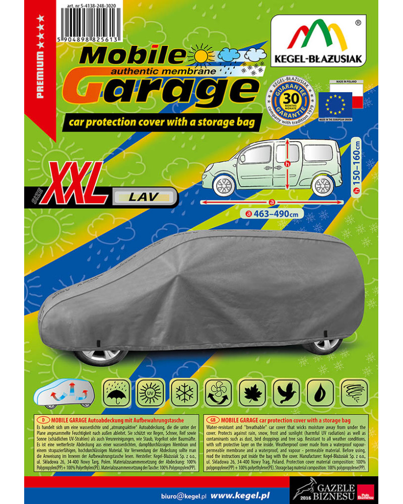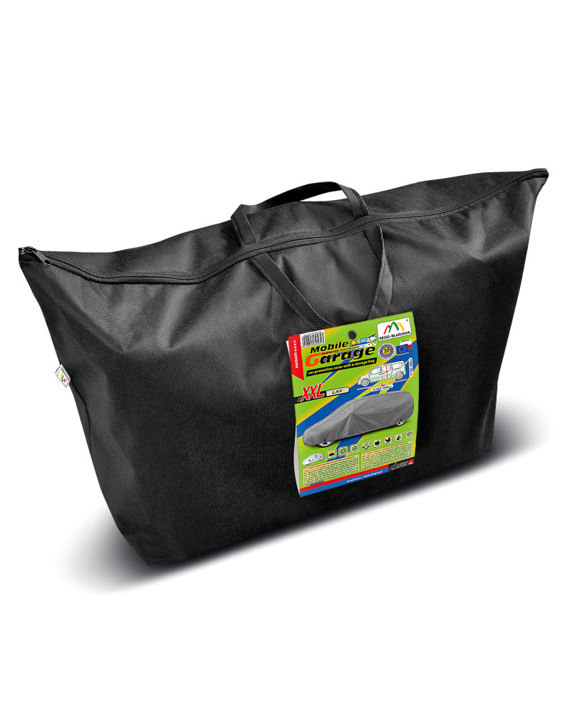 A magas minőségű, autókra való MOBILE GARAGE huzatok vízhatlanok, de páraáteresztőek. A huzat négyrétegű, vízhatlan, páraáteresztő membránból és nehezen vizesedő, de magas páraáteresztő képességgel rendelkező anyagokból készült, majdnem teljesen szoros, de ugyanakkor elvezeti a huzat alatt összegyűlő nedvet. Az egész kocsit, az alsó részével együtt védi a kedvezőtlen környezeti hatásoktól. A huzatok UV-sugárzás ellenállóak. A rögzítésük kocsit körbefogó zsinórral történik, megfelelően összekötve biztosítják a kocsit erős szél esetében is. Mivel az ajánlatunkban több alakban és méretben találhatóak, különböző kocsikhoz illenek. A 30 hónapra szóló garanciának köszönhetően biztos lehet abban, hogy a legmagasabb minőségű terméket vásárolja.