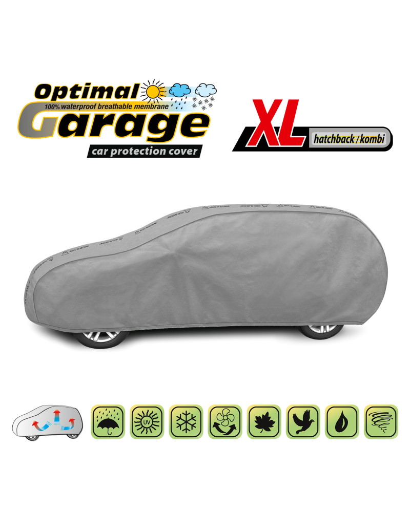Membrános, vízálló, mégis páraáteresztő autóhuzat Optimal Garage. Még intenzív eső esetén is vízálló, ugyanakkor páraáteresztő, mely elvezeti a nedvességet a huzat alól. Időjárásálló huzat, amely teljes egészében nagyfokú páraáteresztő membránból készült. Védelmet nyújt az eső, a hó, a fagy és a (káros UV) napsugarak ellen, valamint az olyan szennyező anyagok, például a por, a madárürülék és a fanedvek ellen.