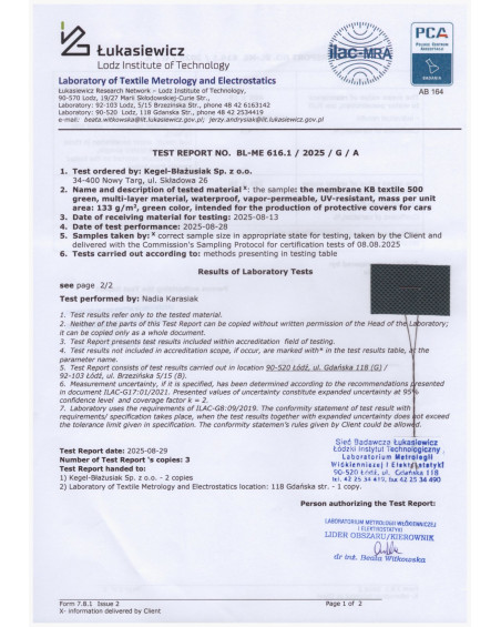 Egy autótakaró ponyva tartósságát a nap UV sugárzásával, a magas hőmérséklettel, esővel, faggyal, hóval és a használatból eredő szennyeződésekkel szemben tanúsított ellenállása határozza meg. Szakértőink többéves saját tesztelési tapasztalat alapján, illetve a PN-EN ISO 4892-3 kutatási szabványok alapján kidolgozták az anyagok környezeti hatásokkal szemben tanúsított tartósságának hatékony tesztelési módszereit. Az USA Atlas UV teszt-kamrában alapos vizsgálaton esik át minden egyes szállítani kívánt anyag, melyekből a Kegel-Błażusiak ponyvák készülnek. A gyártás során felhasznált anyagok szigorú minőségellenőrzésére hagyatkozva tehát akár intenzív használat mellett is garantáljuk az autótakaró ponyvák tartósságát .