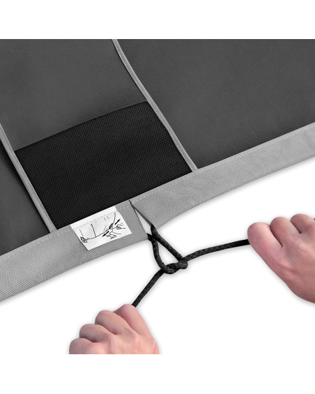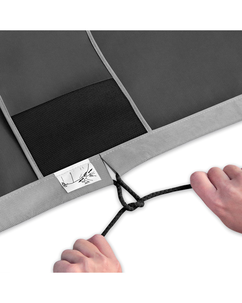 Mielőtt feltenné a huzatot az autóra, hajtsa be az oldalsó tükröket, valamint hajtsa össze vagy csavarja le az antennát. A huzatot tiszta és száraz autóra helyezze fel, a felirattal kifelé. A huzat megfelelő felhelyezésének érdekében a huzaton egy FRONT (elülső résznél) és REAR (hátsó résznél) feliratú címke található (a jelölések a kocsi elülső és hátsó részének felelnek meg). Tegye keresztbe a köteleket, így alakítsa ki az első csomót, majd erősen húzza meg a köteleket olyan módon, hogy a köteleket a jármű hátsó szélével párhuzamosan irányítja (lásd a 2. ábra a huzat belső címkéjén). Kösse össze az összehúzó köteleket, és nézze meg, hogy a csomó a kötél meghúzása után, nem lazult-e meg. Amennyiben a csomó meglazul, ismételje meg az eljárást, de ezúttal változtassa meg a kötés módját. A köteleket vezesse át a huzat alsó szélén lévő hurkokon a kocsi kerekei mellett, majd rögzítse a huzatot az abroncsokhoz (de ne a dísztárcsákhoz).