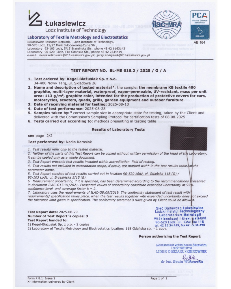 Egy autótakaró ponyva tartósságát a nap UV sugárzásával, a magas hőmérséklettel, esővel, faggyal, hóval és a használatból eredő szennyeződésekkel szemben tanúsított ellenállása határozza meg. Szakértőink többéves saját tesztelési tapasztalat alapján, illetve a PN-EN ISO 4892-3 kutatási szabványok alapján kidolgozták az anyagok környezeti hatásokkal szemben tanúsított tartósságának hatékony tesztelési módszereit. Az USA Atlas UV teszt-kamrában alapos vizsgálaton esik át minden egyes szállítani kívánt anyag, melyekből a Kegel-Błażusiak ponyvák készülnek. A gyártás során felhasznált anyagok szigorú minőségellenőrzésére hagyatkozva tehát akár intenzív használat mellett is garantáljuk az autótakaró ponyvák tartósságát .