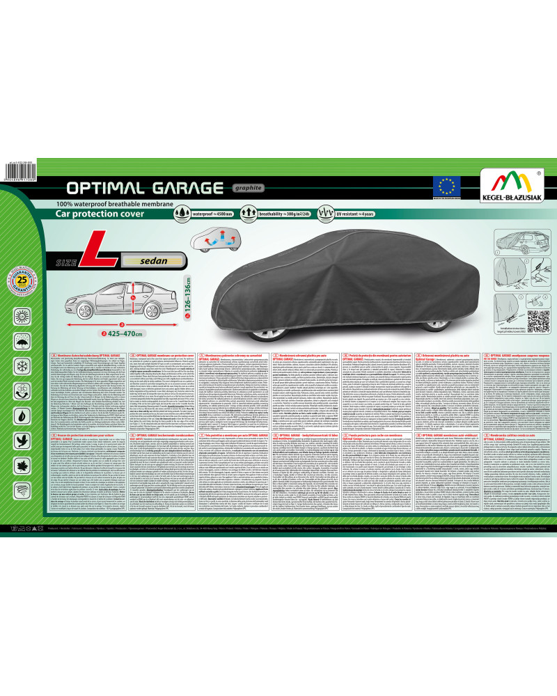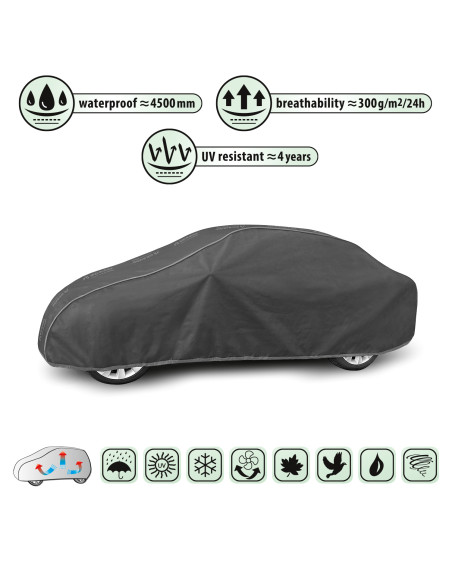 Membrános, vízálló, mégis páraáteresztő autóhuzat Optimal Garage. Még intenzív eső esetén is vízálló, ugyanakkor páraáteresztő, mely elvezeti a nedvességet a huzat alól. Időjárásálló huzat, amely teljes egészében nagyfokú páraáteresztő membránból készült. Védelmet nyújt az eső, a hó, a fagy és a (káros UV) napsugarak ellen, valamint az olyan szennyező anyagok, például a por, a madárürülék és a fanedvek ellen.