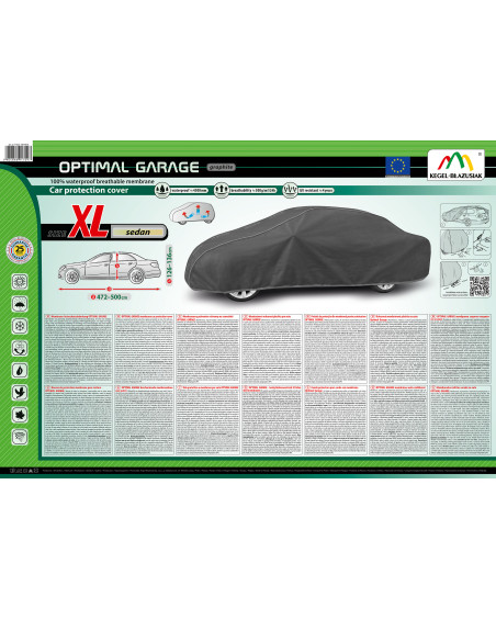 Membrános, vízálló, mégis páraáteresztő autóhuzat Optimal Garage. Még intenzív eső esetén is vízálló, ugyanakkor páraáteresztő, mely elvezeti a nedvességet a huzat alól. Időjárásálló huzat, amely teljes egészében nagyfokú páraáteresztő membránból készült. Védelmet nyújt az eső, a hó, a fagy és a (káros UV) napsugarak ellen, valamint az olyan szennyező anyagok, például a por, a madárürülék és a fanedvek ellen.