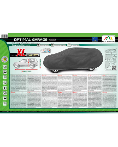 Membrános, vízálló, mégis páraáteresztő autóhuzat Optimal Garage. Még intenzív eső esetén is vízálló, ugyanakkor páraáteresztő, mely elvezeti a nedvességet a huzat alól. Időjárásálló huzat, amely teljes egészében nagyfokú páraáteresztő membránból készült. Védelmet nyújt az eső, a hó, a fagy és a (káros UV) napsugarak ellen, valamint az olyan szennyező anyagok, például a por, a madárürülék és a fanedvek ellen.