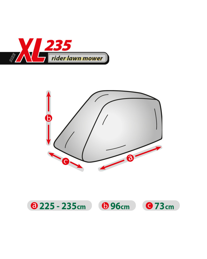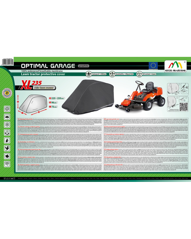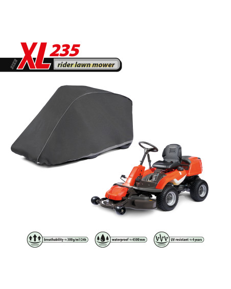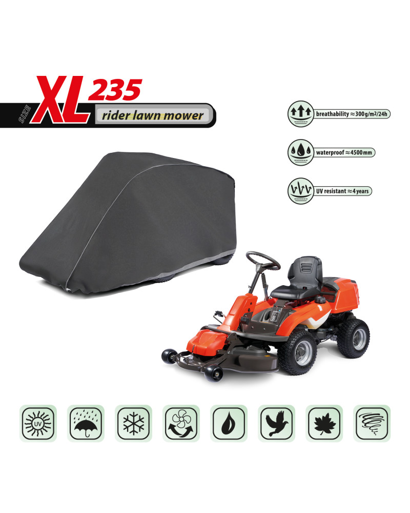Egész évben használható védőhuzat szabadban tárolt benzines fűnyíró védelmére a környezet káros hatásaival szemben. A speciális kialakításnak köszönhetően eső esetén a víz lefolyik a fedélről anélkül, hogy a fedél alá behatolna. Védi a fűnyírót az esőtől, hótól, fagytól és a napfénytől (káros UV-sugarzástól), valamint az olyan szennyeződésektől, mint a por, madárürülék és fanedvek. Csökkenti a korróziót és a műanyag alkatrészek öregedését, védelmet nyújt a festett és a krómozott alkatrészek kifakulása és mattá válása ellen. A védőhuzat teljes mértékben ellenálló minden időjárási körülménnyel szemben.