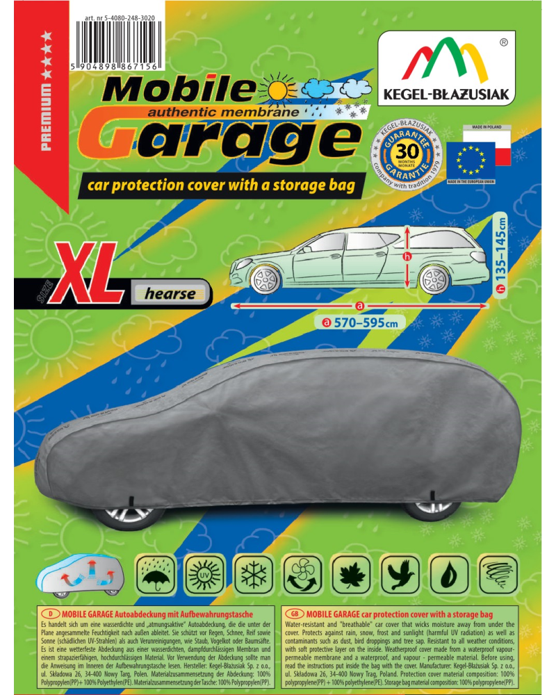 A magas minőségű, autókra való MOBILE GARAGE huzatok vízhatlanok, de páraáteresztőek. A huzat négyrétegű, vízhatlan, páraáteresztő membránból és nehezen vizesedő, de magas páraáteresztő képességgel rendelkező anyagokból készült, majdnem teljesen szoros, de ugyanakkor elvezeti a huzat alatt összegyűlő nedvet. Az egész kocsit, az alsó részével együtt védi a kedvezőtlen környezeti hatásoktól. A huzatok UV-sugárzás ellenállóak. A rögzítésük kocsit körbefogó zsinórral történik, megfelelően összekötve biztosítják a kocsit erős szél esetében is. Mivel az ajánlatunkban több alakban és méretben találhatóak, különböző kocsikhoz illenek. A 30 hónapra szóló garanciának köszönhetően biztos lehet abban, hogy a legmagasabb minőségű terméket vásárolja.