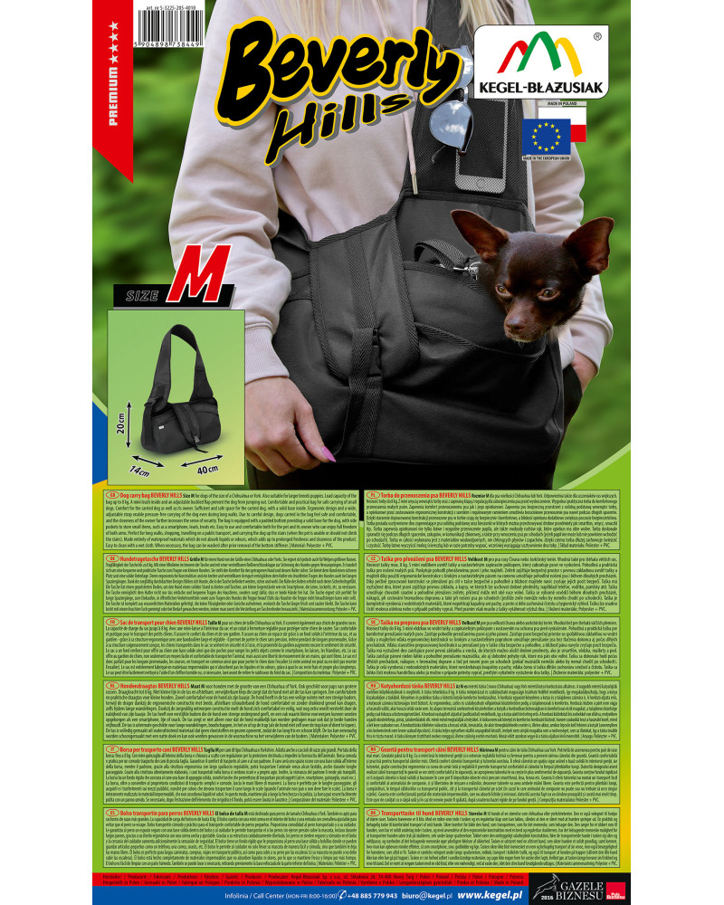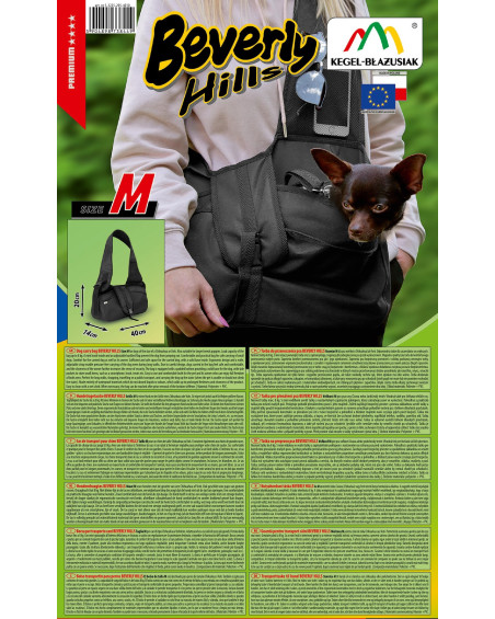 Az M-es méretű táska Csivava (Chihuahua) vagy York méretű kutya hordozására alkalmas. A nagyobb méretű kutyafajták esetében kölyökkutyáknak is megfelelő. A táska teherbírása 8 kg. A táska minipórázzal és szabályozható magasságú lezárható fedéllel rendelkezik, így megakadályozhatja, hogy a kutya kiszabaduljon a táskából.