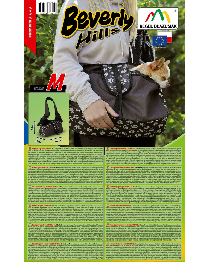 Az M-es méretű táska Csivava (Chihuahua) vagy York méretű kutya hordozására alkalmas. A nagyobb méretű kutyafajták esetében kölyökkutyáknak is megfelelő. A táska teherbírása 8 kg. A táska minipórázzal és szabályozható magasságú lezárható fedéllel rendelkezik, így megakadályozhatja, hogy a kutya kiszabaduljon a táskából.