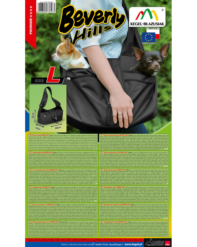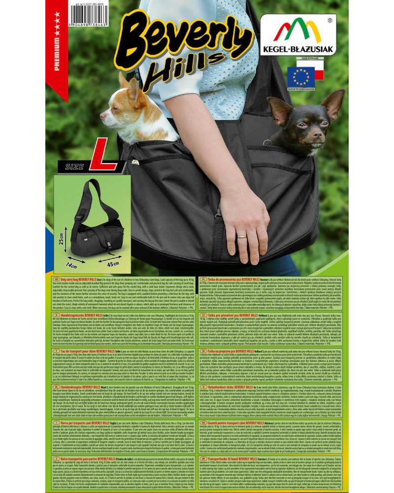 Az L-es méretű táska Máltai selyemkutya vagy két Csivava (Chihuahua) kutya hordozására alkalmas. A táska teherbírása 10 kg. A táska két minipórázzal és szabályozható magasságú lezárható fedéllel rendelkezik, így megakadályozhatja, hogy a kutyák kiszabaduljanak a táskából.