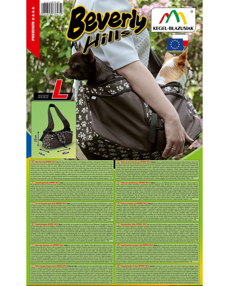 Az L-es méretű táska Máltai selyemkutya vagy két Csivava (Chihuahua) kutya hordozására alkalmas. A táska teherbírása 10 kg. A táska két minipórázzal és szabályozható magasságú lezárható fedéllel rendelkezik, így megakadályozhatja, hogy a kutyák kiszabaduljanak a táskából.