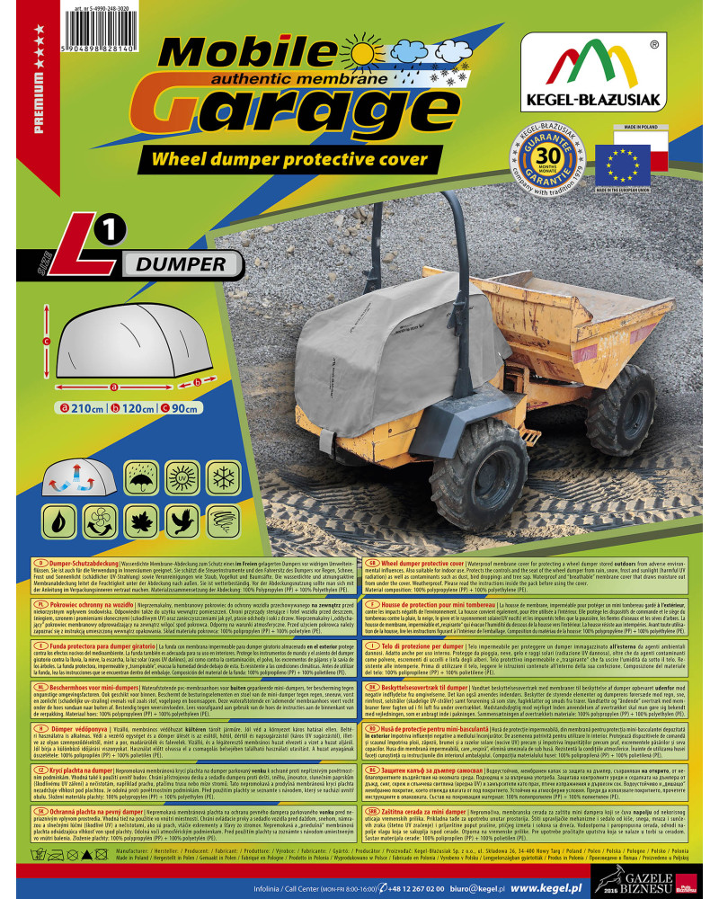 Vízálló, membrános védőhuzat kültéren tárolt járműre. Jól véd a környezet káros hatásai ellen. Beltéri használatra is alkalmas. Védi a vezérlő egységet és a dömper ülését is az esőtől, hótól, dértől és napsugárzástól (káros UV sugárzástól), illetve az olyan szennyeződésektől, mint a por, madárürülék és falevelek. Vízálló, és a légáteresztő membrános huzat elvezeti a vizet a huzat aljáról. Jól bírja a különböző időjárási viszonyokat. Használat előtt olvassa el a csomagolás belsejében található használati utasítást.