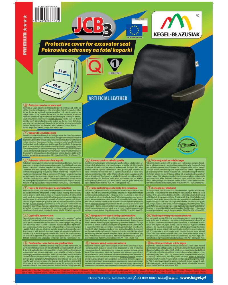 Vízálló, egész évben használható védőhuzat fülkével rendelkező vagy fülke nélküli kotrógépek ülésére. Jól illeszkedik a fenti ábrán bemutatott fotel alakjához és méreteihez. Védi a kotrógép ülését a szennyeződésektől, kopástól, illetve a fülke nélküli kotrógépek esetében az esőtől, hótól, dértől, napsugárzástól (káros UV-sugárzástól), illetve folyadékoktól és egyéb szennyeződésektől.