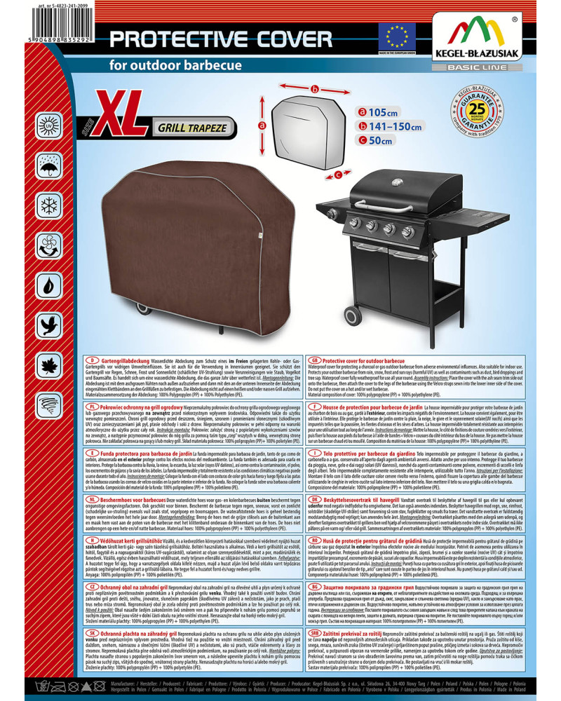 Vízálló, és a kedvezőtlen környezeti hatásokkal szembeni védelmet nyújtó huzat szabadban tárolt kerti gáz- vagy szén tüzelésű grillsütőhöz. Beltéri használatra is alkalmas. Védi a kerti grillsütőt az esőtől, hótól, fagytól és a napsugaraktól (káros UV-sugárzástól), valamint az olyan szennyeződésektől, mint a por, madárürülék és fanedvek. Vízálló, egész évben használható védőhuzat, mely teljesen ellenálló az időjárási hatásokkal szemben.