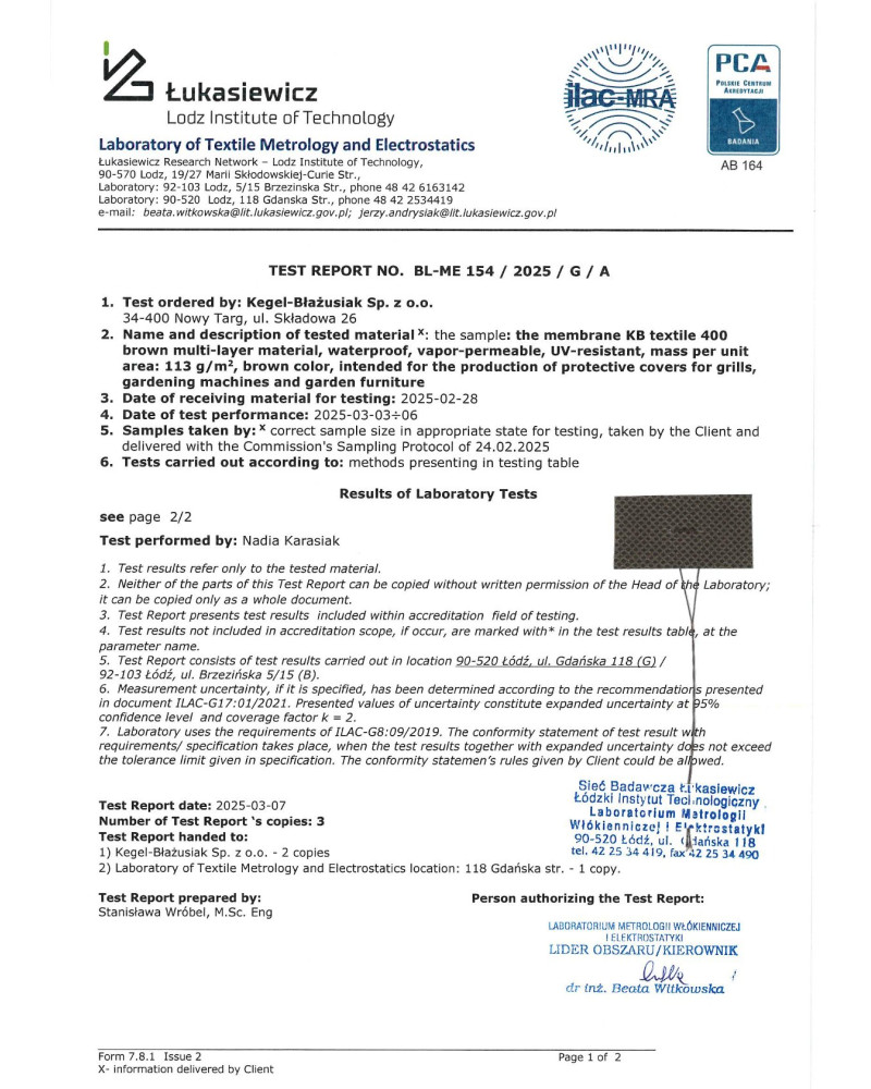 Egy autótakaró ponyva tartósságát a nap UV sugárzásával, a magas hőmérséklettel, esővel, faggyal, hóval és a használatból eredő szennyeződésekkel szemben tanúsított ellenállása határozza meg. Szakértőink többéves saját tesztelési tapasztalat alapján, illetve a PN-EN ISO 4892-3 kutatási szabványok alapján kidolgozták az anyagok környezeti hatásokkal szemben tanúsított tartósságának hatékony tesztelési módszereit. Az USA Atlas UV teszt-kamrában alapos vizsgálaton esik át minden egyes szállítani kívánt anyag, melyekből a Kegel-Błażusiak ponyvák készülnek. A gyártás során felhasznált anyagok szigorú minőségellenőrzésére hagyatkozva tehát akár intenzív használat mellett is garantáljuk az autótakaró ponyvák tartósságát .