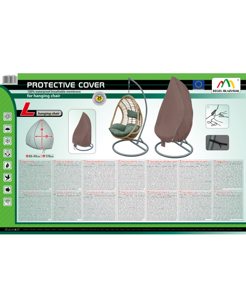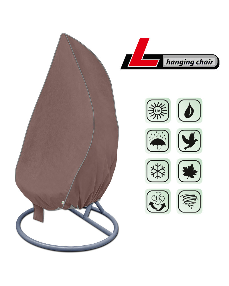Membrános, vízálló ugyanakkor légáteresztő huzat kültéren tárolt függőfotel kedvezőtlen környezeti hatások ellen való védelmére. Teljes egészében magas mértékben páraáteresztő membránból készült, időjárásálló huzat. Vízálló még erős esőben is, ugyanakkor páradiffúziós, így a nedvesség kifelé távozik huzat alól. Védi a függő széket és a vázát az esőtől, hótól, fagyoktól és a nap sugaraitól (káros UV sugárzás), valamint az olyan szennyeződésektől, mint a por, madárürülék és a fák nedveitől. Csökkenti a műanyag vagy fa alkatrészek korrózióját és öregedését, megvédi a festéket és a krómozott alkatrészeket a kifakulástól és a mattá válásától. Könnyen felhelyezhető és levehető. Erős rögzítés a zsinóros összehúzónak és a vázhoz való további rögzítésnek köszönhetően, mely hatékonyan védi a huzatot attól, hogy a szél letépje. Beltéri használatra is alkalmas.