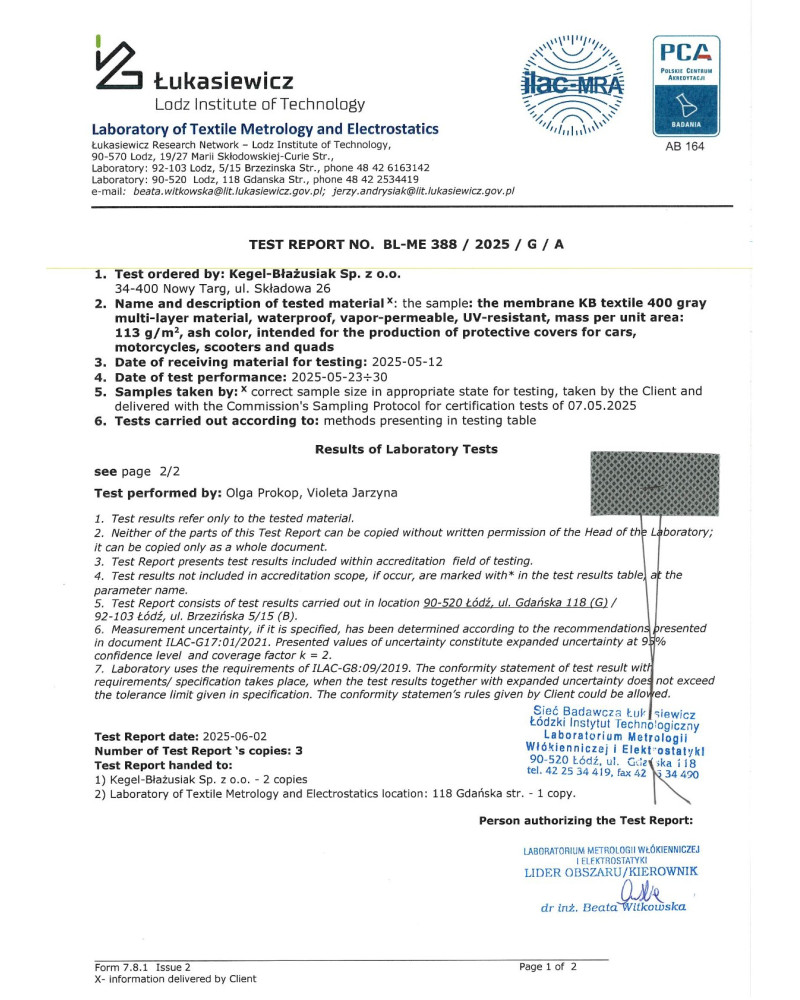 A jó ponyvahuzatoknak nemcsak védeniük kell az autót a csapadéktól, szennyeződésektől és a nap káros sugaraitól, de biztonságosnak is kell lenniük. Pontosan ilyenek a Kegel-Błażusiak takaró ponyvák. Szakértőink hosszú tesztsorozatokkal vizsgálják a takaró ponyvákat. A tesztelés során megvizsgálják a különböző időjárási körülményekkel szembeni védelem hatékonyságát, a vízállóságot, a ponyva alatt felgyülemlő pára elvezetését, az autó fényezésének biztonságát a ponyva használatakor, valamint az autóra történő rögzítés hatékonyságát normál és extrém időjárási körülmények között. A Kegel-Błażusiak társaság, csak olyan termékeket gyárt, amelyek ezeken a teszteléseken eredményesen bizonyítottak.