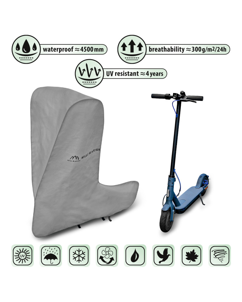 Membrános, vízálló ugyanakkor páraáteresztő védőhuzat, amely védelmet nyújt az elektromos robogó számára a káros környezeti hatásokkal szemben. Ez az időjárásálló huzat teljes egészében magasfokú páraáteresztő membránból készült. Akár erős eső esetén is vízálló, ugyanakkor páraáteresztő, valamint elvezeti a nedvességet a huzat alól. Csökkenti a korróziót és a műanyag alkatrészek öregedését, véd a festett és a krómozott alkatrészek kifakulása és elszíneződése ellen. Alkalmas az elektromos robogó kültéri tárolására is rövid távon. Elasztikus összehúzó kötéllel rögzítendő, így könnyen fel- és levehető. A robogó alján található rögzítőelemek megakadályozzák, hogy a szél letépje a huzatot a robogóról. Beltéri tárolásra is használható.