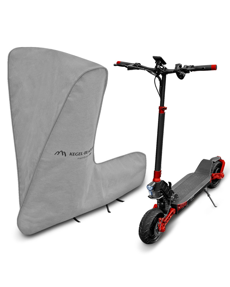 Membrános, vízálló ugyanakkor páraáteresztő védőhuzat, amely védelmet nyújt az elektromos robogó számára a káros környezeti hatásokkal szemben. Ez az időjárásálló huzat teljes egészében magasfokú páraáteresztő membránból készült. Akár erős eső esetén is vízálló, ugyanakkor páraáteresztő, valamint elvezeti a nedvességet a huzat alól. Csökkenti a korróziót és a műanyag alkatrészek öregedését, véd a festett és a krómozott alkatrészek kifakulása és elszíneződése ellen. Alkalmas az elektromos robogó kültéri tárolására is rövid távon. Elasztikus összehúzó kötéllel rögzítendő, így könnyen fel- és levehető. A robogó alján található rögzítőelemek megakadályozzák, hogy a szél letépje a huzatot a robogóról. Beltéri tárolásra is használható.