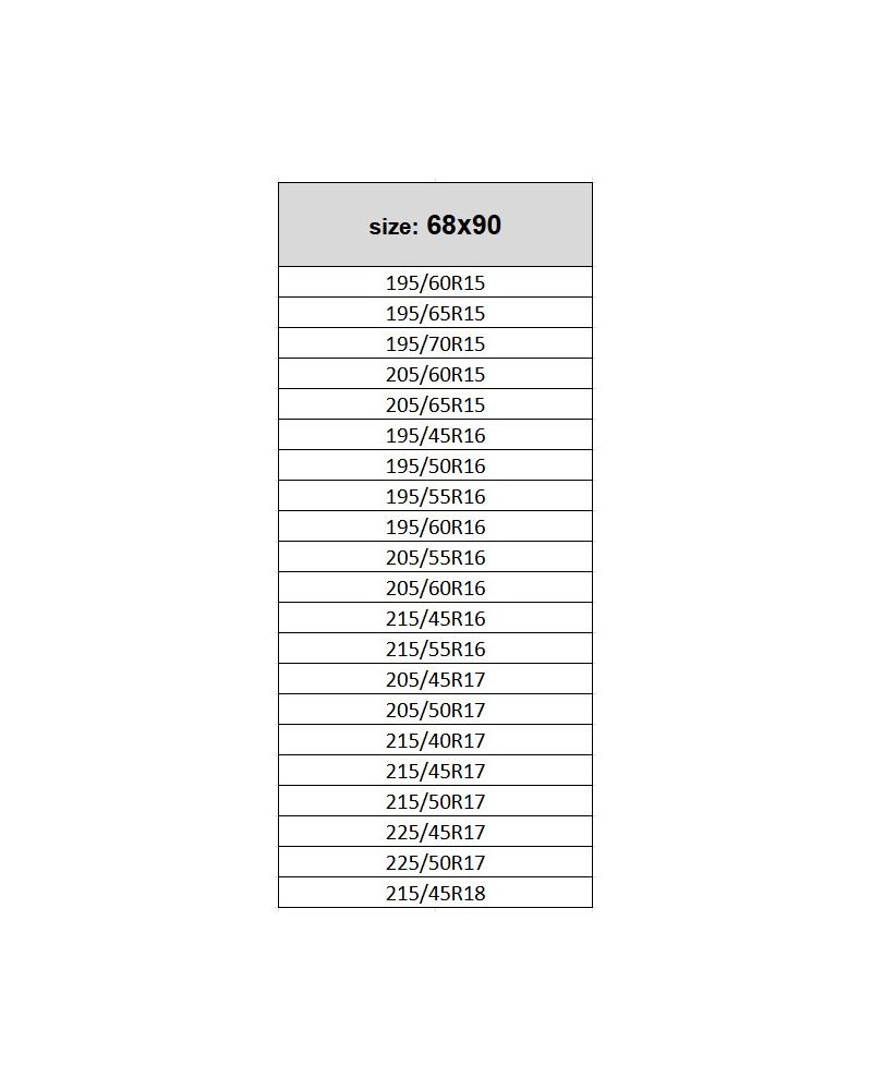 195/60R15, 195/65R15, 195/70R15, 205/60R15, 205/65R15, 195/45R16, 195/50R16, 195/55R16, 195/60R16, 205/55R16, 205/60R16, 215/45R16, 215/55R16, 205/45R17, 205/50R17, 215/40R17, 215/45R17, 215/50R17, 225/45R17, 225/50R17, 215/45R18